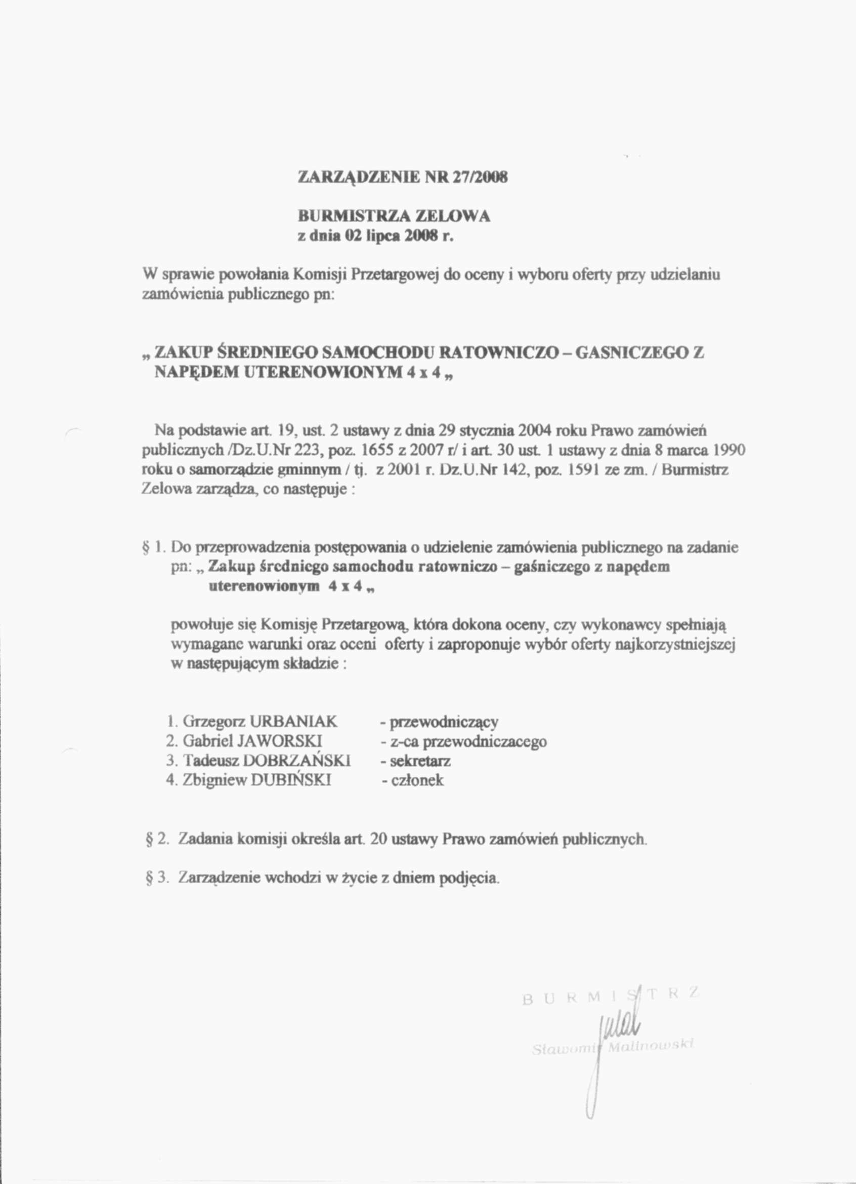 | Tytuł aktu prawnego - skrócony: | Zarządzenie w sprawie powołania Komisji Przetargowej do oceny i wyboru oferty przy udzielaniu zamówienia publicznego pn: "ZAKUP ŚREDNIEGO SAMOCHODU RATOWNICZO-GAŚNICZEGO Z NAP DEM UTERENOWIONYM 4X4" |
