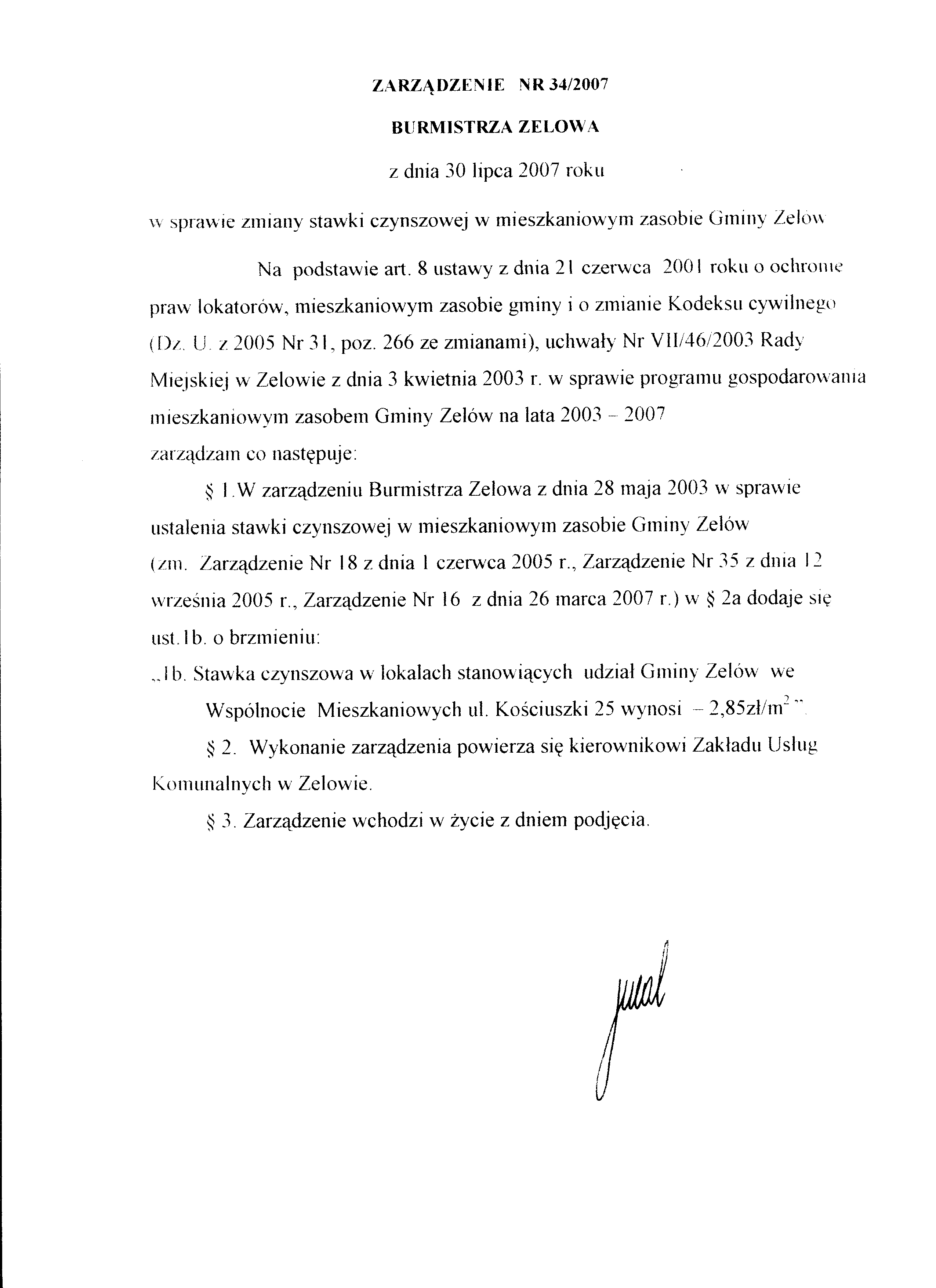 | Tytuł aktu prawnego - skrócony: | Zarządzenie w sprawie zmiany stawki czynszowej w mieszkaniowym zasobie Gminy Zelów |