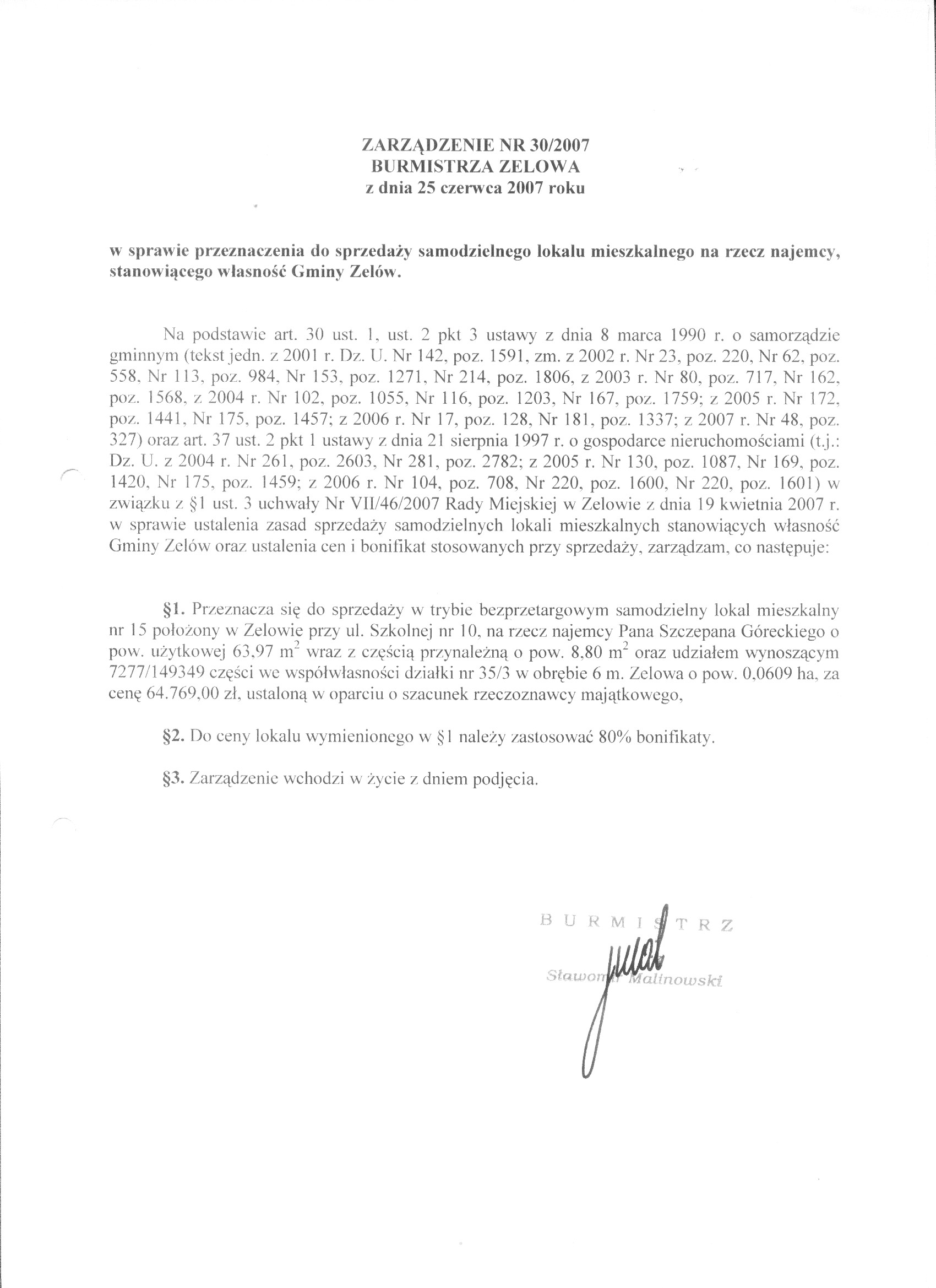 | Tytuł aktu prawnego - skrócony: | Zarządzenie w sprawie przeznaczenia do sprzedaży samodzielnego lokalu mieszkalnego na rzecz najemcy, stanowiącego własność Gminy Zelów. |