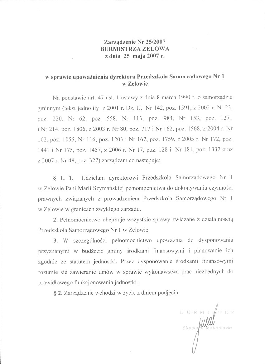 | Tytuł aktu prawnego - skrócony: | Zarządzenie w sprawie upoważnienia dyrektora Przedszkola Samorządowego Nr 1 w Zelowie |