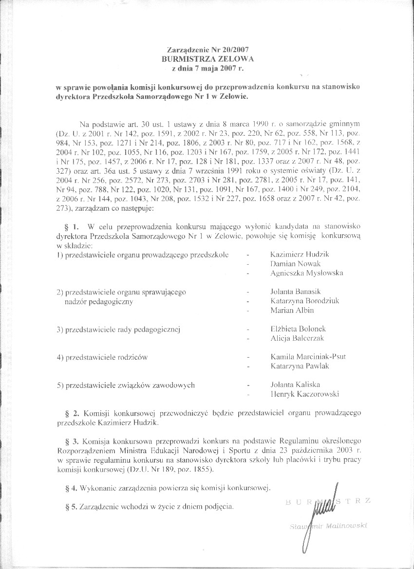 | Tytuł aktu prawnego - skrócony: | Zarządzenie w sprawie powołania komisji konkursowej do przeprowadzenia konkursu na stanowisko dyrektora Przedszkola Samorządowego Nr 1 w Zelowie |