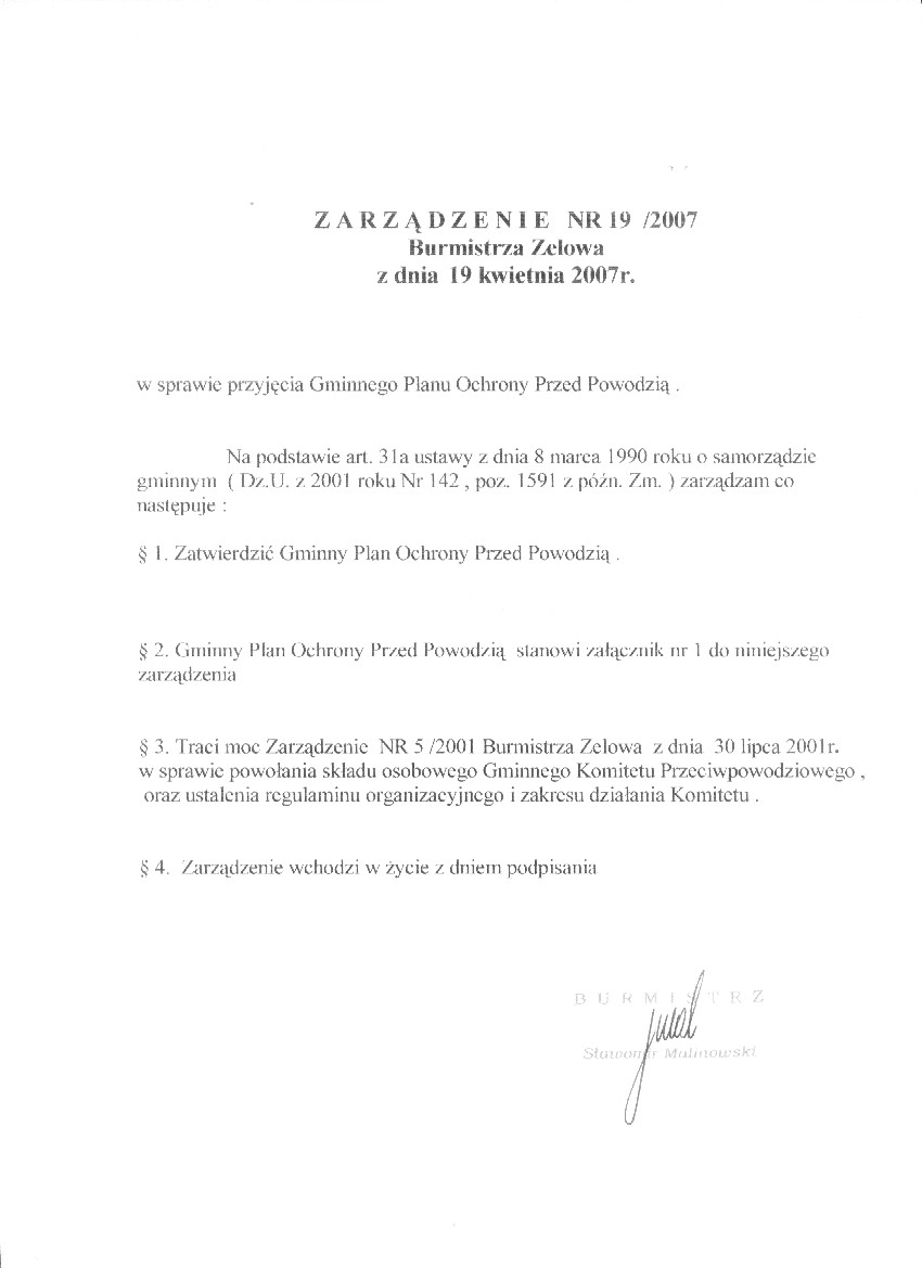 | Informacje dodatkowe i uzupełniające: | Traci moc Zarządzenie Nr 5/2001 Burmistrza Zelowa z dnia 30 lipca 2001 r. w sprawie powołania składu osobowego Gminnego Komitetu Przeciwpowodziowego oraz ustalenia regulaminu organizacyjnego i zakresu działania Komitetu. |