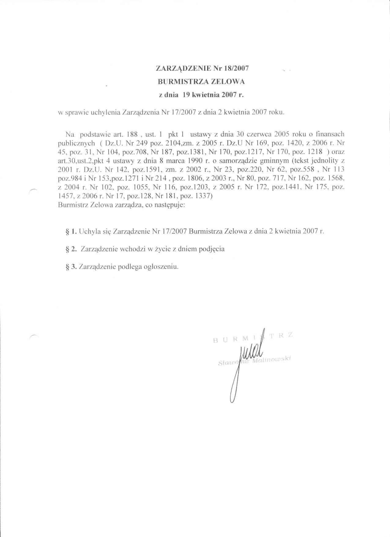 | Tytuł aktu prawnego - skrócony: | Zarządzenie w sprawie uchylenia Zarządzenia Nr 17/2007 z dnia 2 kwietnia 2007 roku |