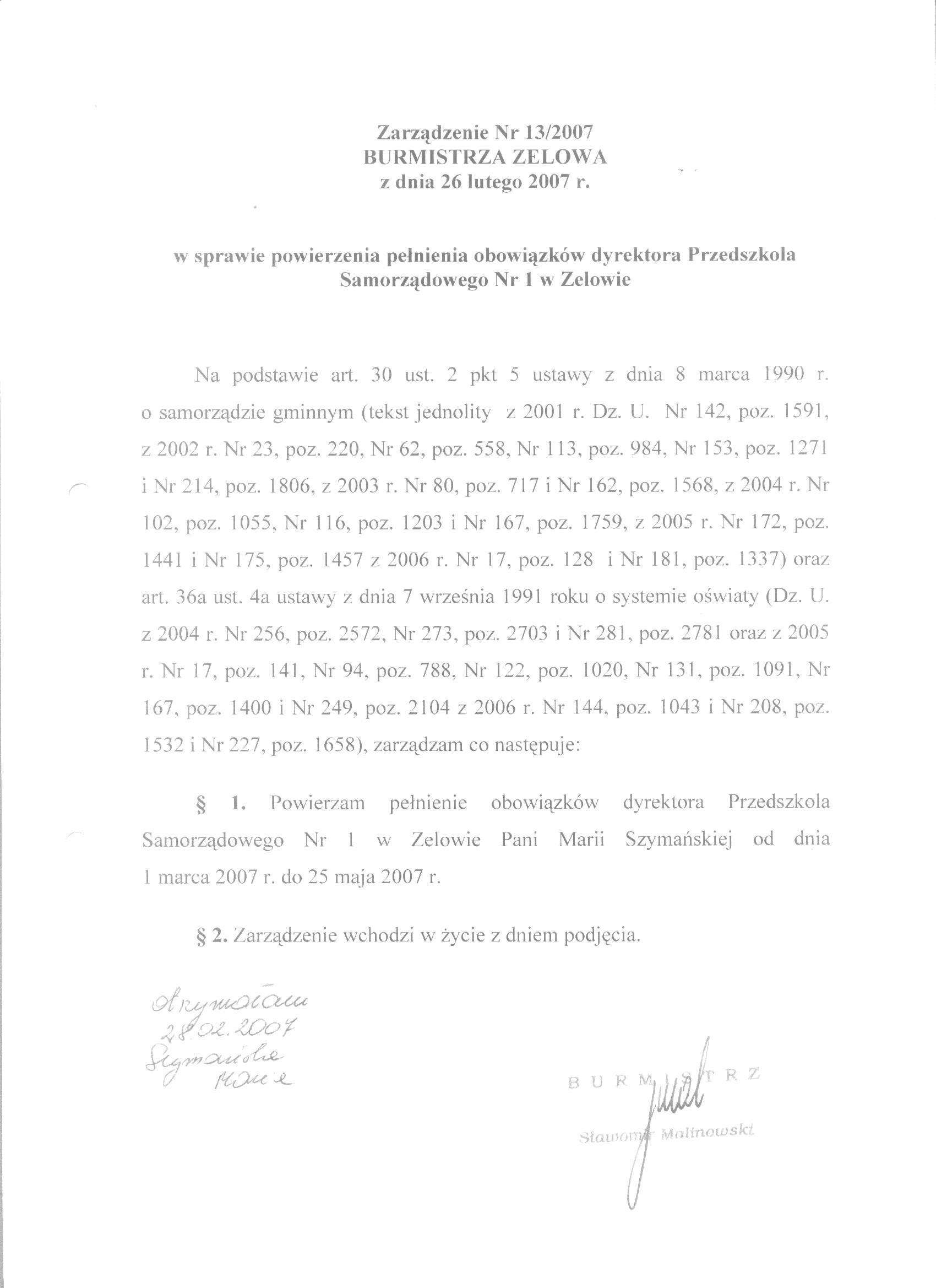 | Tytuł aktu prawnego - skrócony: | Zarządzenie w sprawie powierzenia pełnienia obowiązków dyrektora Przedszkola Samorządowego Nr 1 w Zelowie |