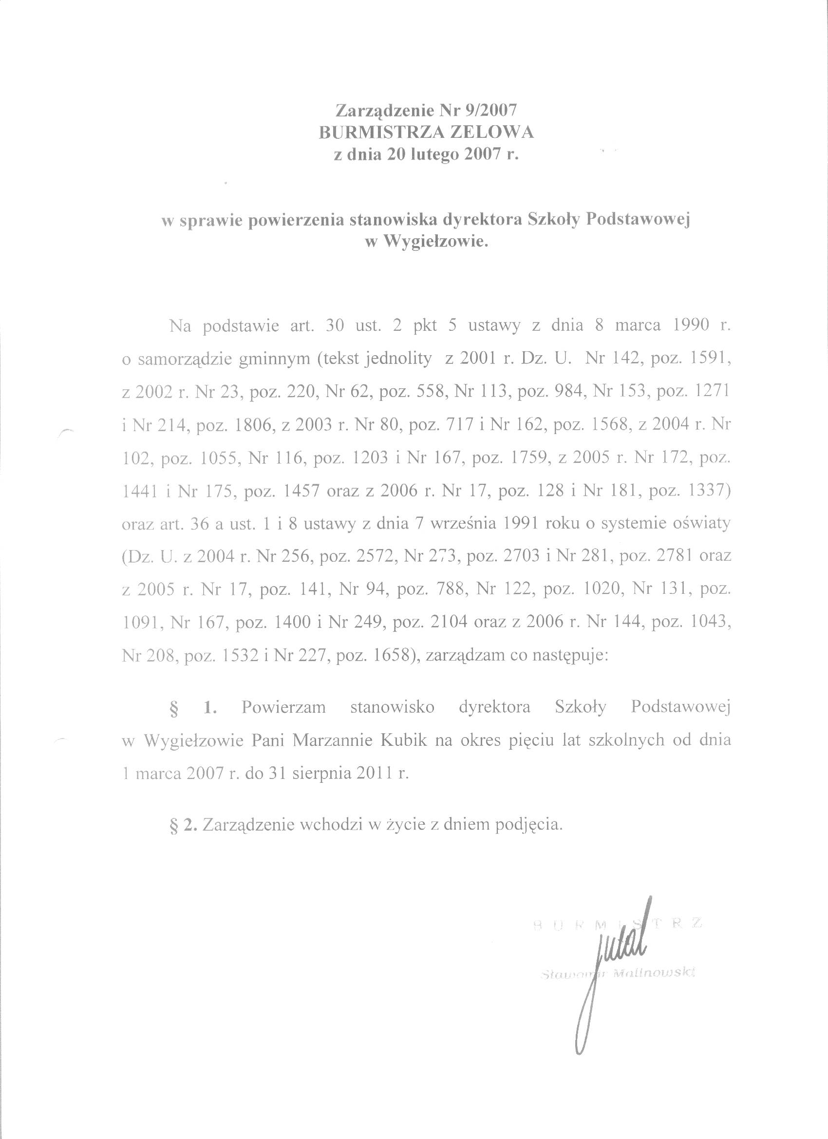 | Tytuł aktu prawnego - skrócony: | Zarządzenie w sprawie powierzenia stanowiska dyrektora Szkoły Podstawowej w Wygiełzowie |