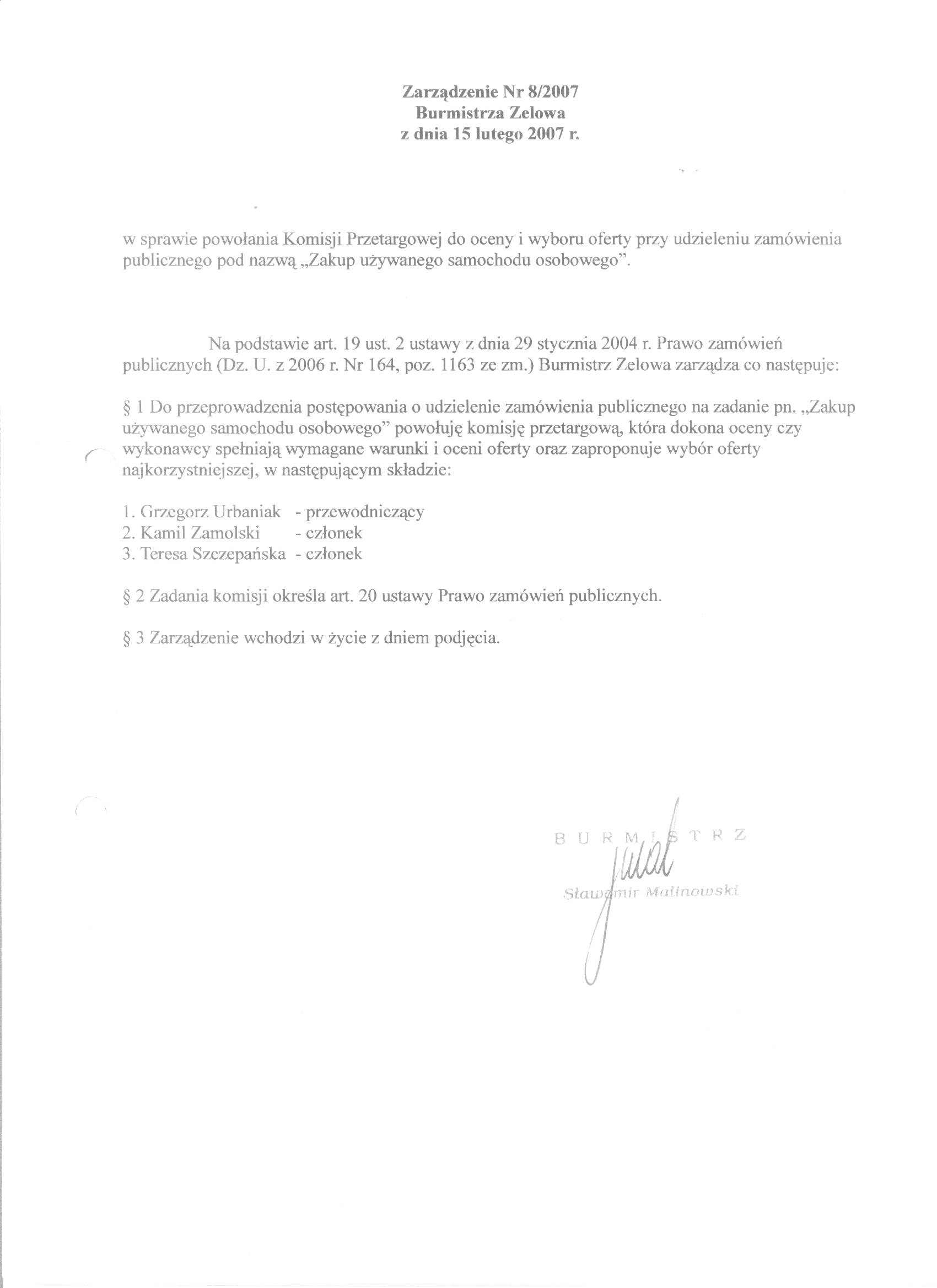 | Tytuł aktu prawnego - skrócony: | Zarządzenie w sprawie powołania Komisji Przetargowej do oceny i wyboru oferty przy udzieleniu zamówienia publicznego pod nazwą "Zakup uzywanego samochodu osobowego". |