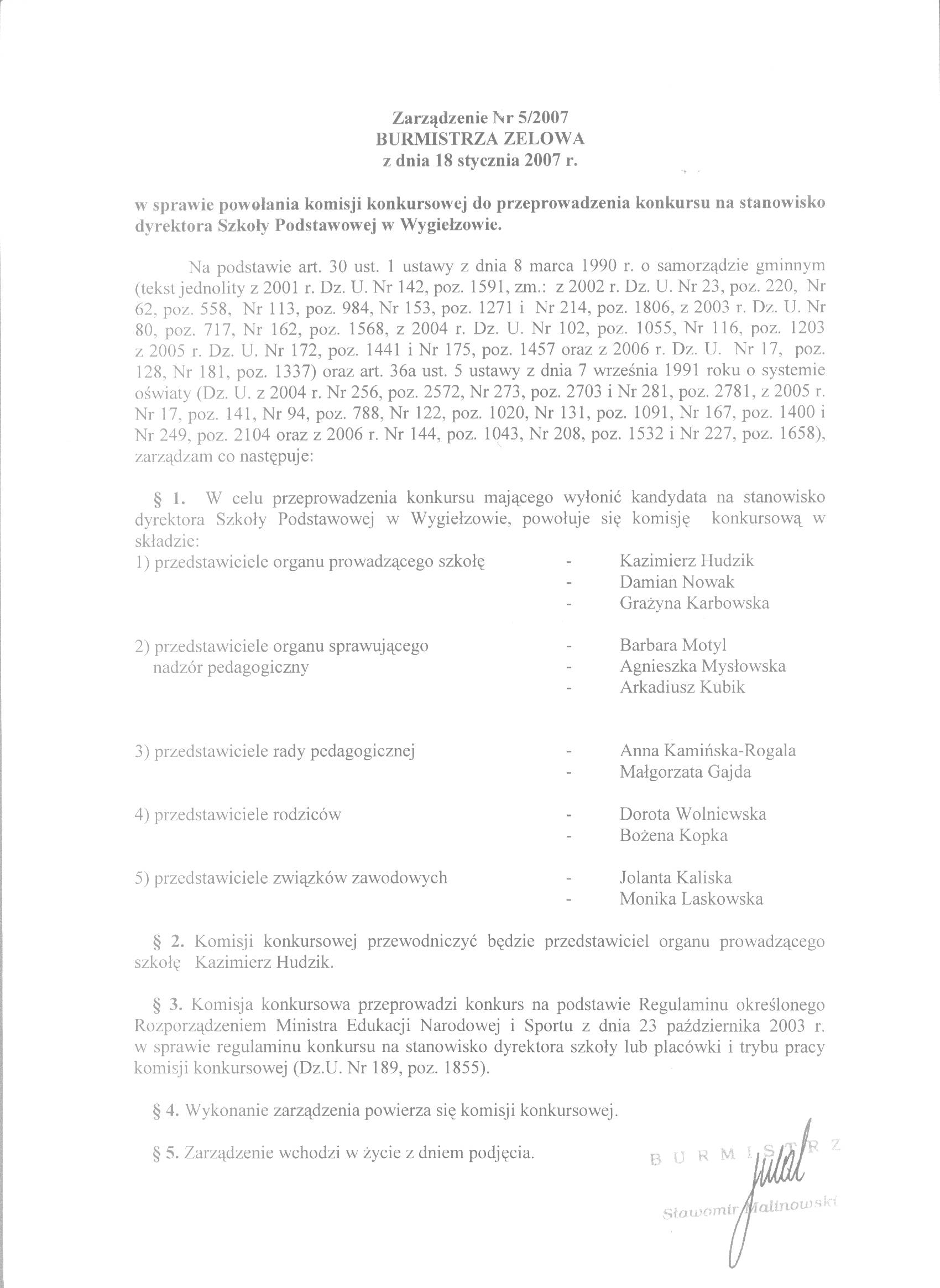 | Tytuł aktu prawnego - skrócony: | Zarządzenie w sprawie powołania komisji konkursowej do przeprowadzenia konkursu na stanowisko dyrektora Szkoły Podstawowej w Wygiełzowie. |
