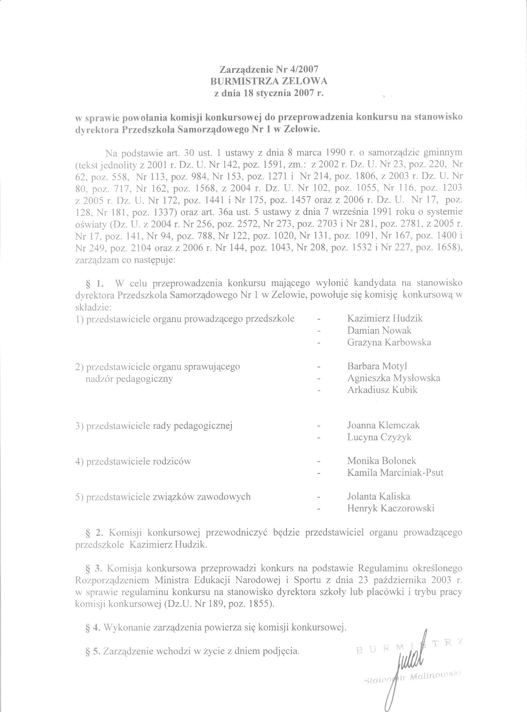 | Tytuł aktu prawnego - skrócony: | Zarządzenie w sprawie powołania komisji konkursowej do przeprowadzenia konkursu na stanowisko dyrektora Przedszkola samorządowego Nr 1 w Zelowie |