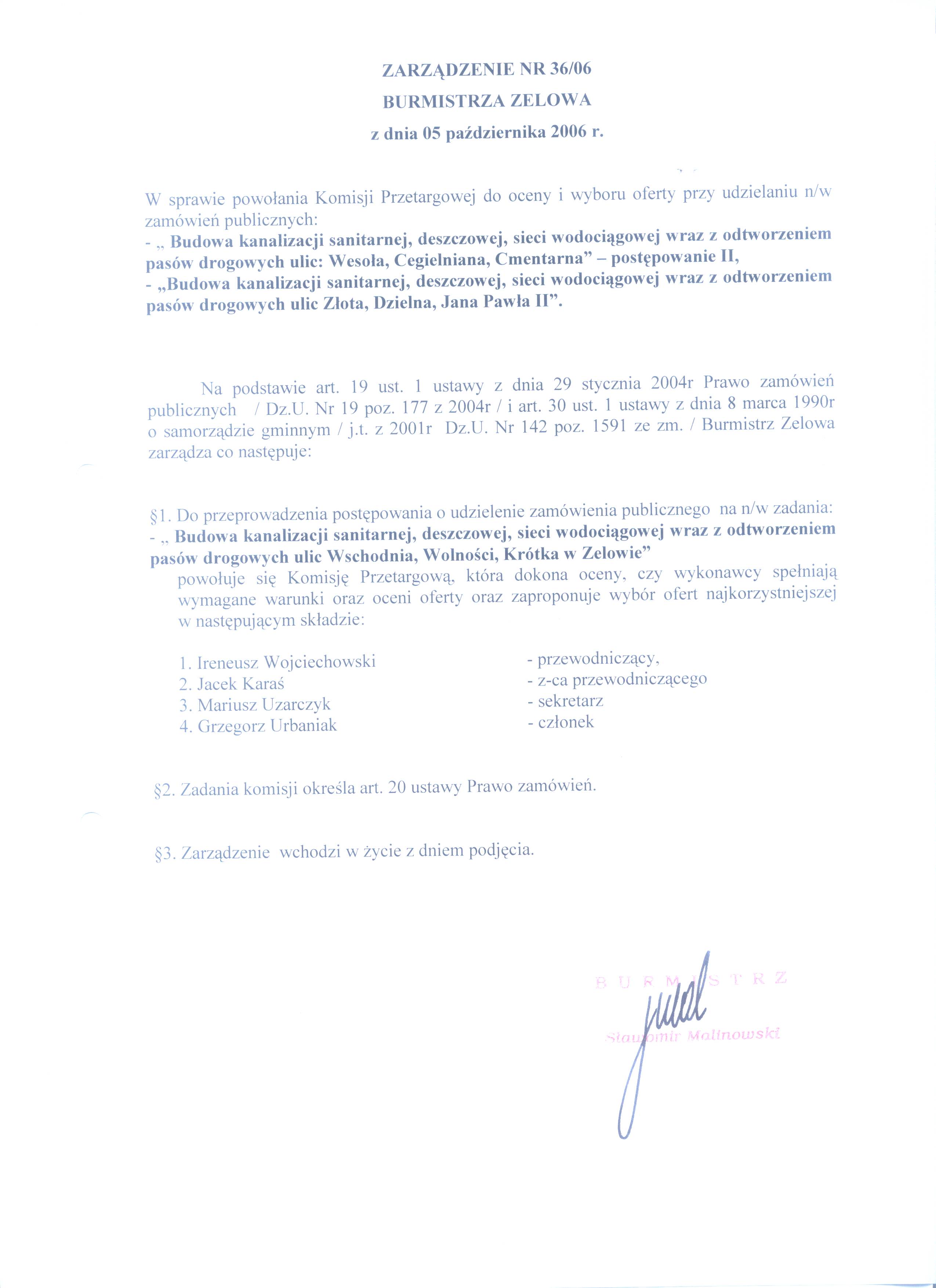 | Tytuł aktu prawnego - skrócony: | Zarządzenie w sprawie powołania Komisji Przetargowej do oceny i wyboru ofert przy udzielaniu n/w zamówień publicznych |