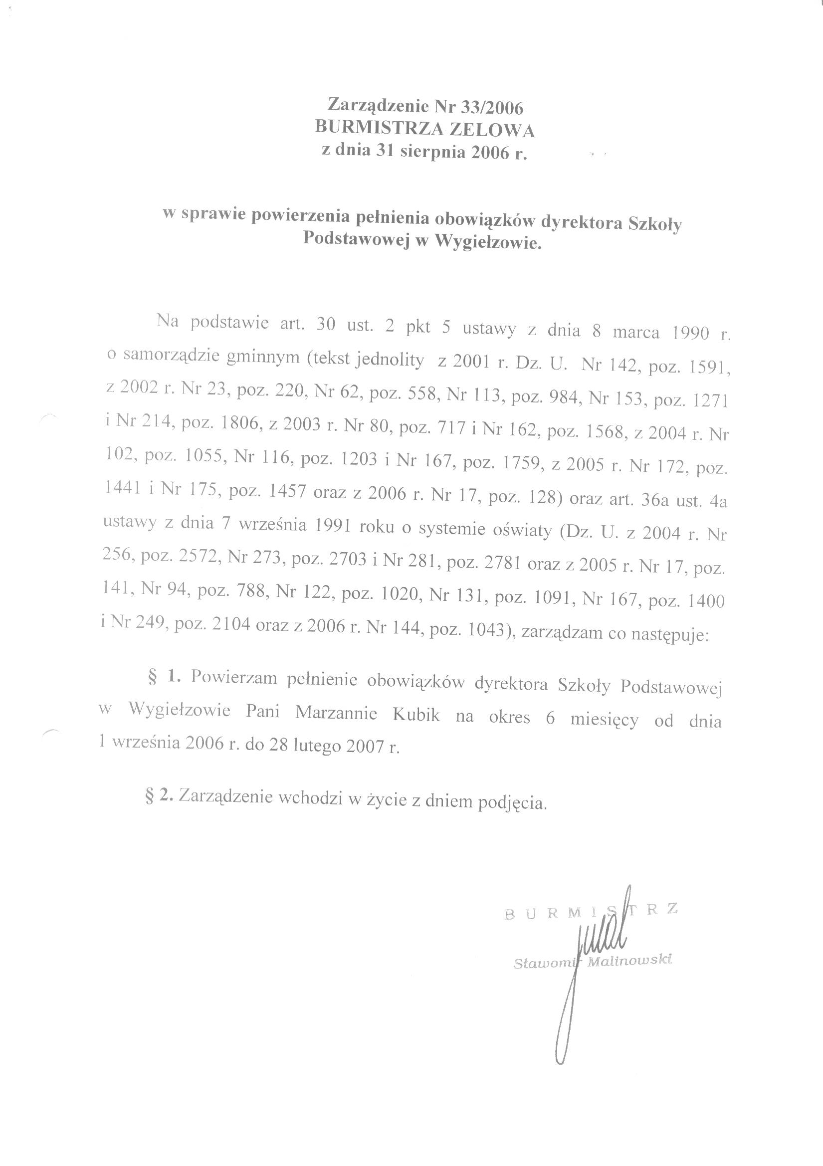 | Tytuł aktu prawnego - skrócony: | Zarządzenie w sprawie powierzenia pełnienia obowiązków dyrektora Szkoły Podstawowej w Wygiełzowie |