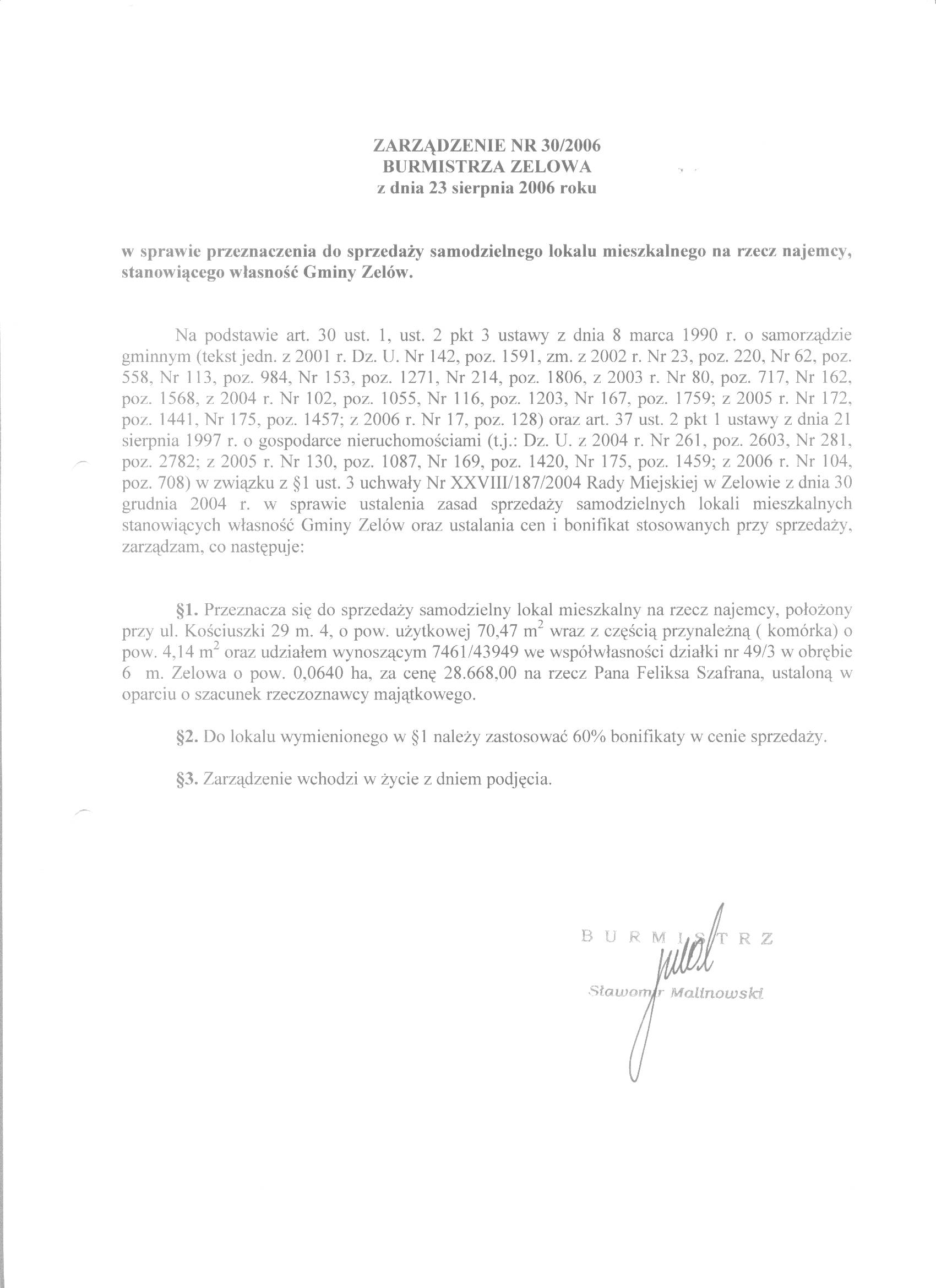 | Tytuł aktu prawnego - skrócony: | Zarządzenie w sprawie przeznaczenia do sprzedaży samodzielnego lokalu mieszkalnego na rzecz najemcy, stanowiącego własność Gminy Zelów. |