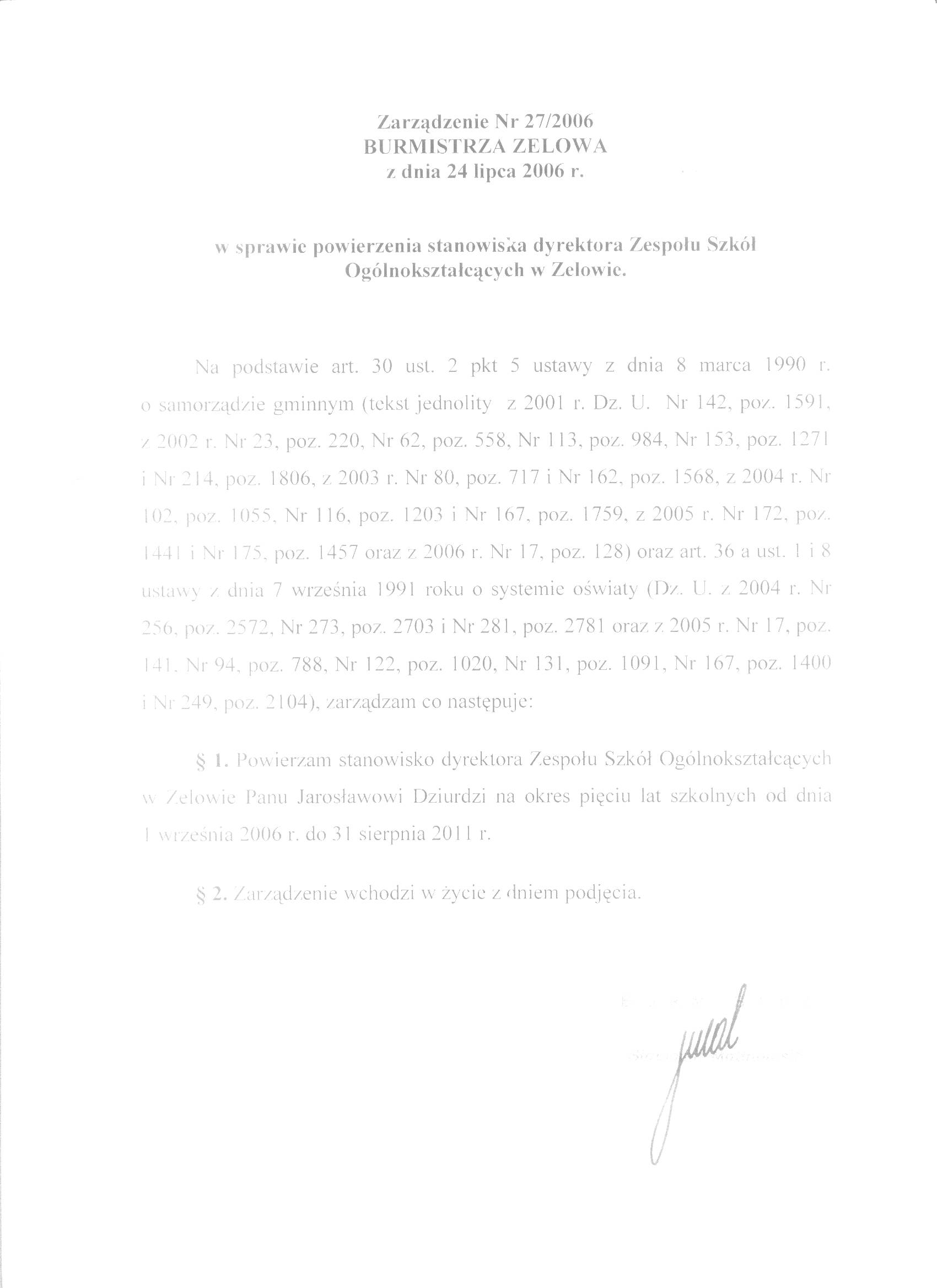 | Tytuł aktu prawnego - skrócony: | Zarządzenie w sprawie powierzenia stanowiska dyrektora Zespołu Szkół Ogólnokształcących w Zelowie |
