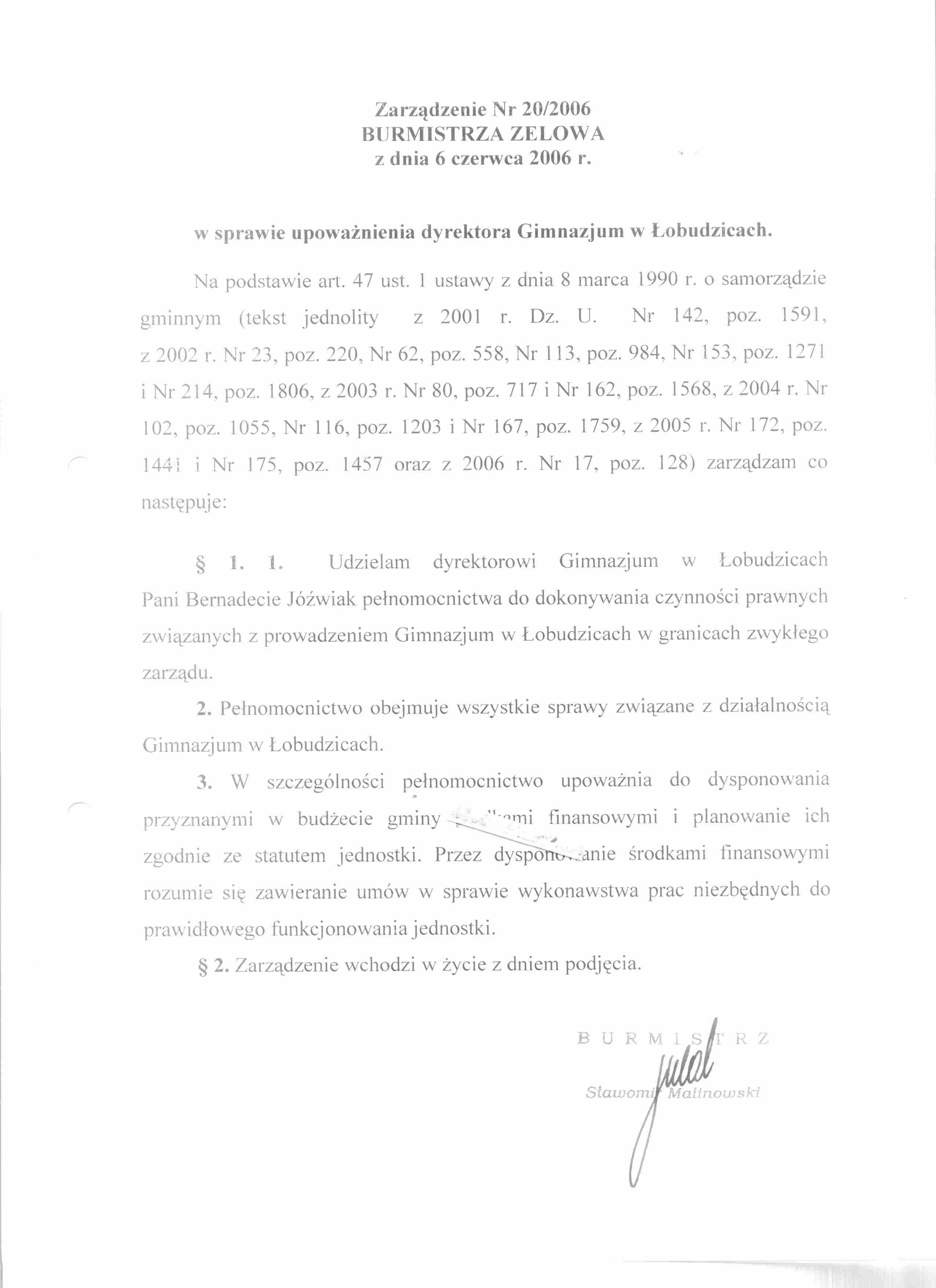 | Tytuł aktu prawnego - skrócony: | Zarządzenie w sprawie upoważnienia dyrektora Gimnazjum w Łobudzicach. |