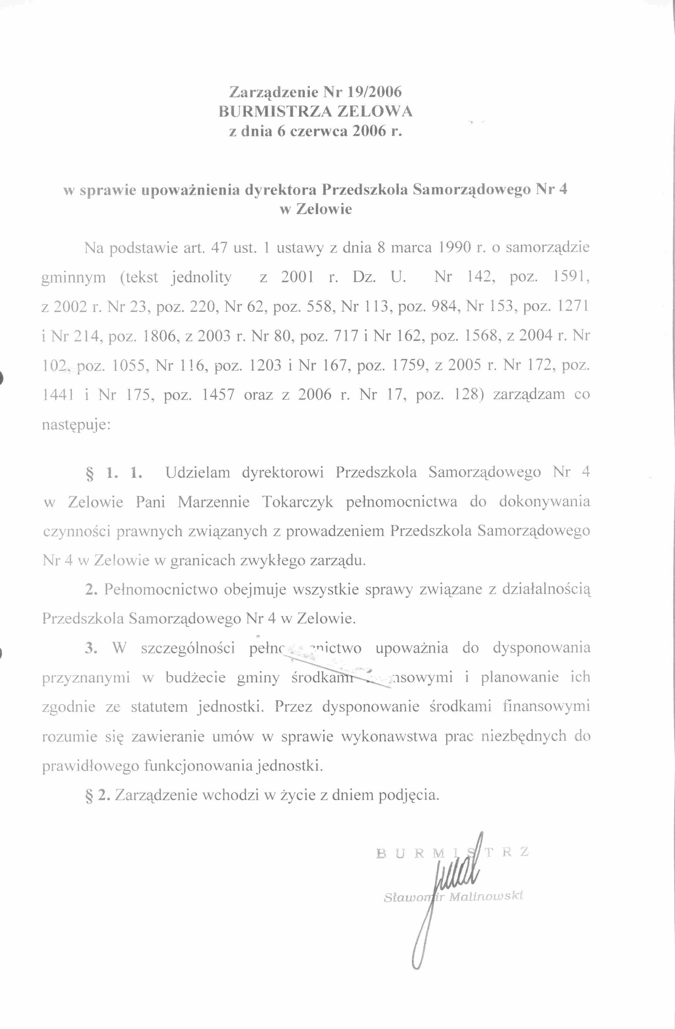 | Tytuł aktu prawnego - skrócony: | Zarządzenie w sprawie upoważnienia dyrektora Przedszkola Samorządowego Nr 4 w Zelowie. |