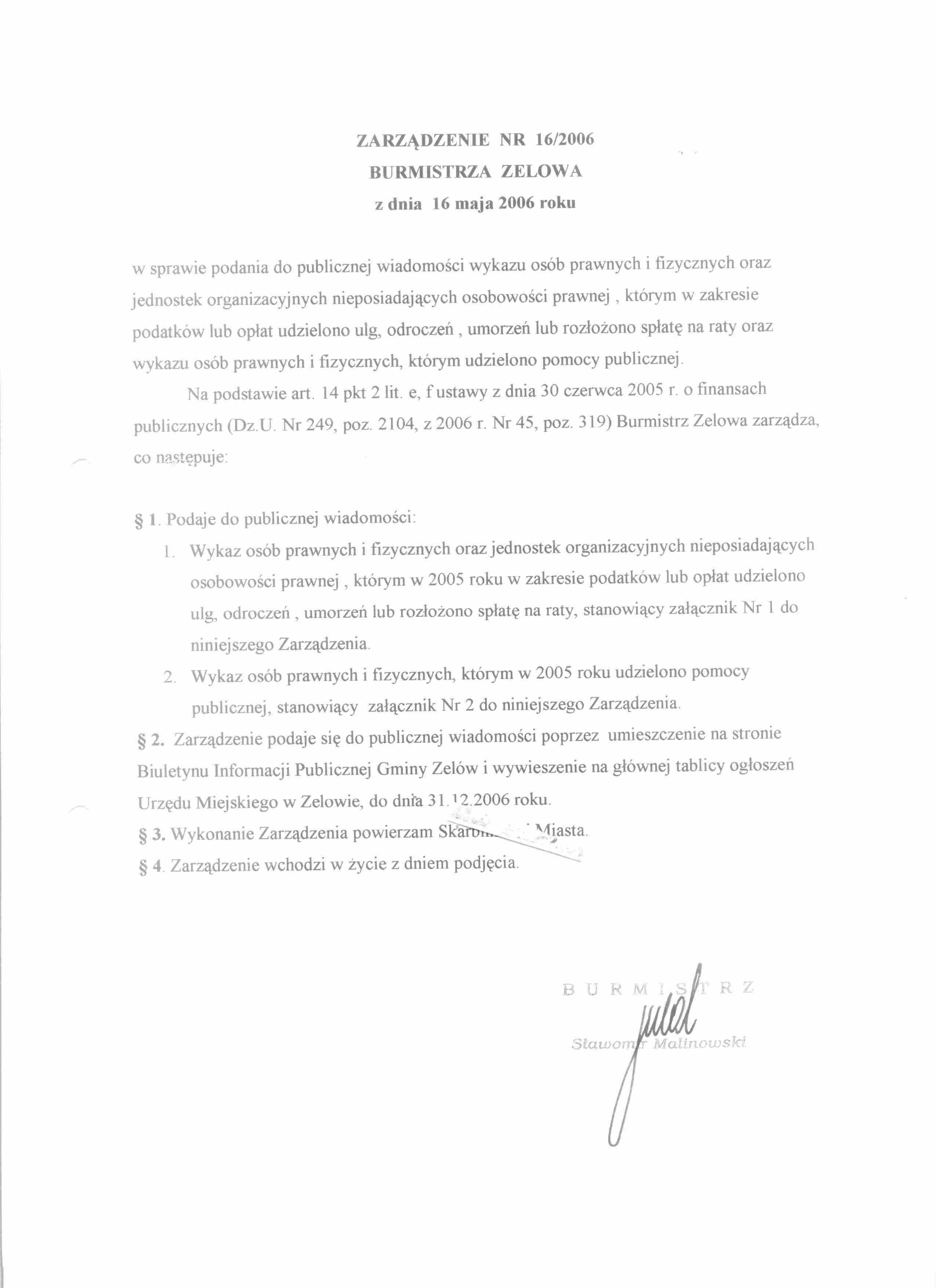| Tytuł aktu prawnego - skrócony: | Zarządzenie w sprawie podania do publicznej wiadomości wykazu osób prawnych i fizycznych oraz jednostek organizacyjnych nieposiadających osobowości prawnej, którym w zakresie podatków lub opłat udzielono ulg, odroczeń, umorzeń lub rozłożono spłatę na raty, jak również wykaz osób prawnych i fizycznych, którym udzielono pomocy publicznej |