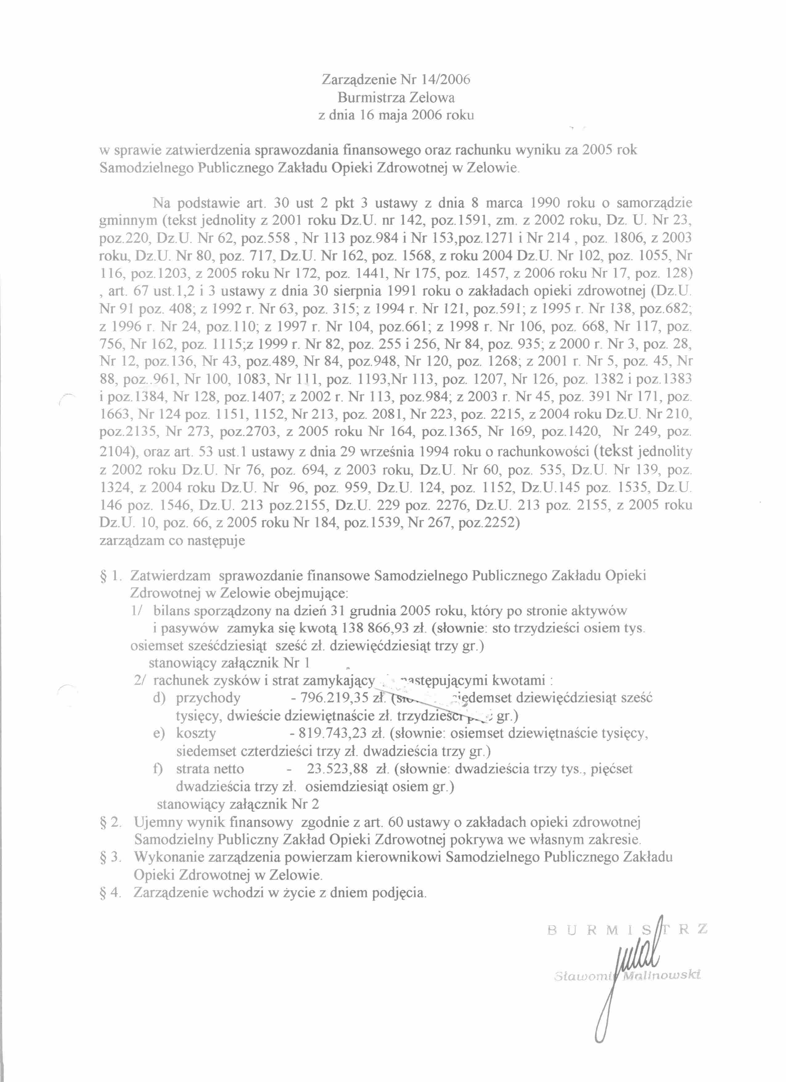 | Tytuł aktu prawnego - skrócony: | Zarządzenie w sprawie zatwierdzenia sprawozdania finansowego oraz rachunku wyniku za 2005 rok Samodzielnego Publicznego Zakładu Opieki Zdrowotnej w Zelowie. |