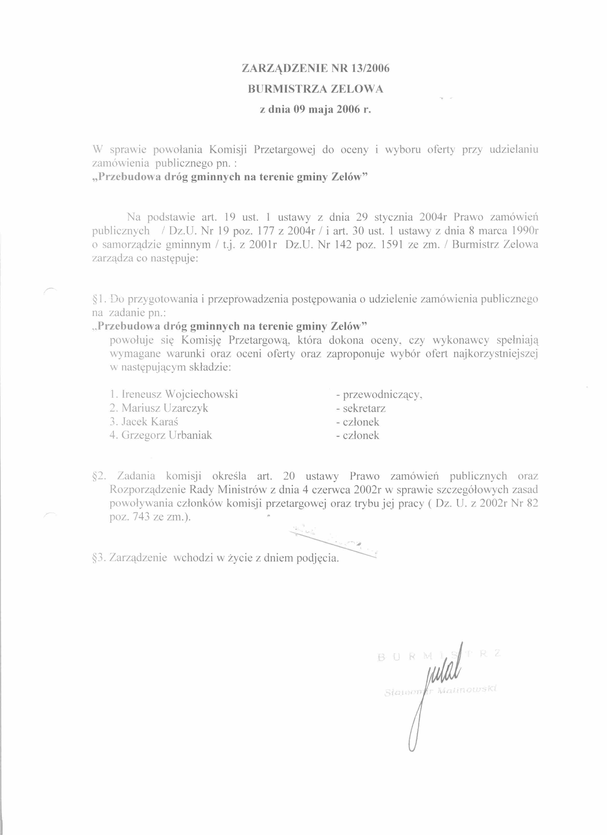 | Tytuł aktu prawnego - skrócony: | Zarządzenie w sprawie powołania Komisji Przetargowej do oceny i wyboru oferty przy udzielaniu zamówienia publicznego pn.:"Przebudowa dróg gminnych na terenie gminy ZElów." |