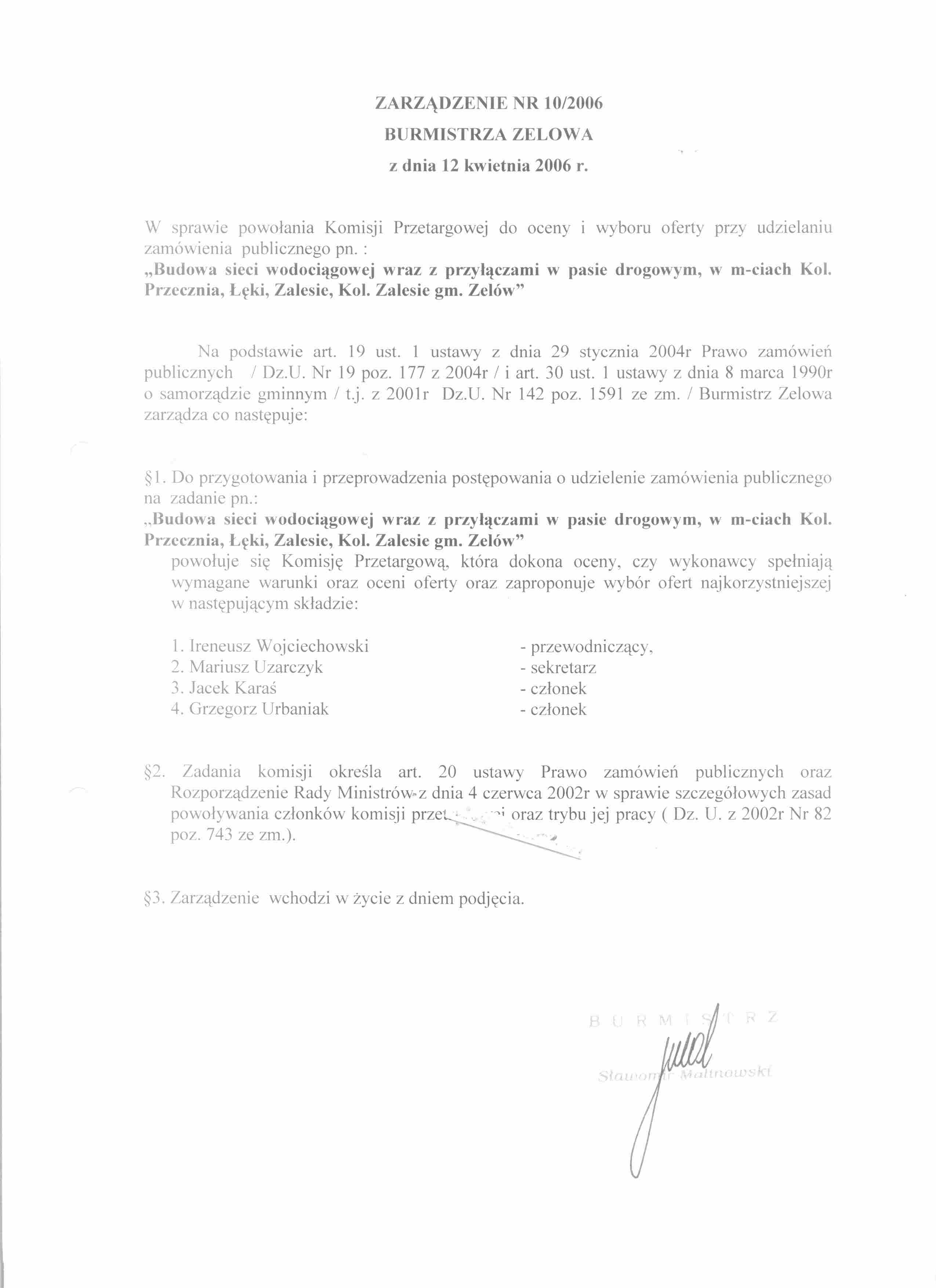 | Tytuł aktu prawnego - skrócony: | Zarządzenie w sprawie powołania Komisji Przetargowej do oceny i wyboru oferty przy udzielaniu zamówienia publicznego pn.:"Budowa sieci wodociągowej wraz z przyłączami w pasie drogowym, w miejscowościach Kol.Przecznia, Łęki, Zalesie, Kol.Zalesie gm.Zelów." |