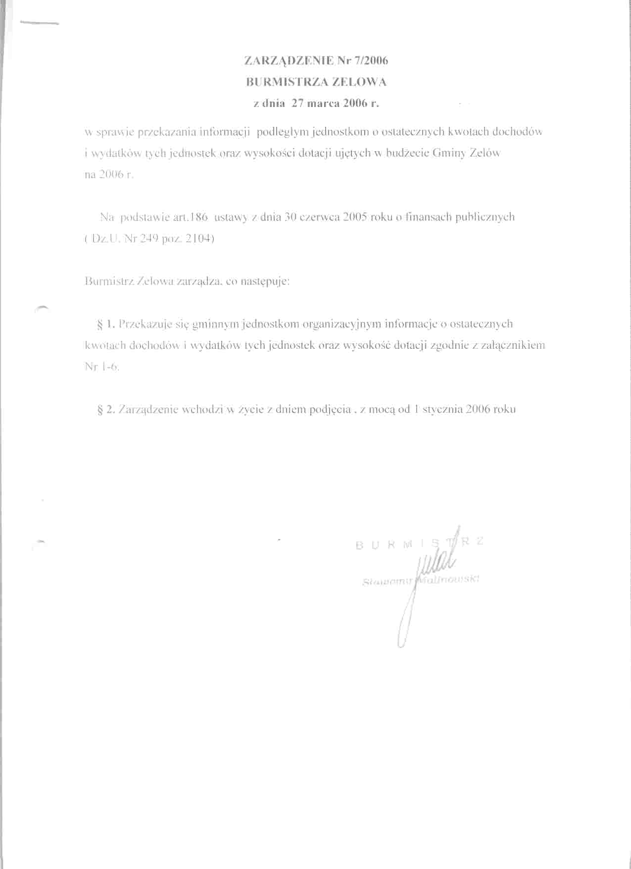 | Tytuł aktu prawnego - skrócony: | Zarządzenie w sprawie przekazania informacji podległym jednostkom o ostatecznych kwotach dochodów i wydatków tych jednostek oraz wysokości dotacji ujętych w budżecie Gminy Zelów na 2006 rok. |