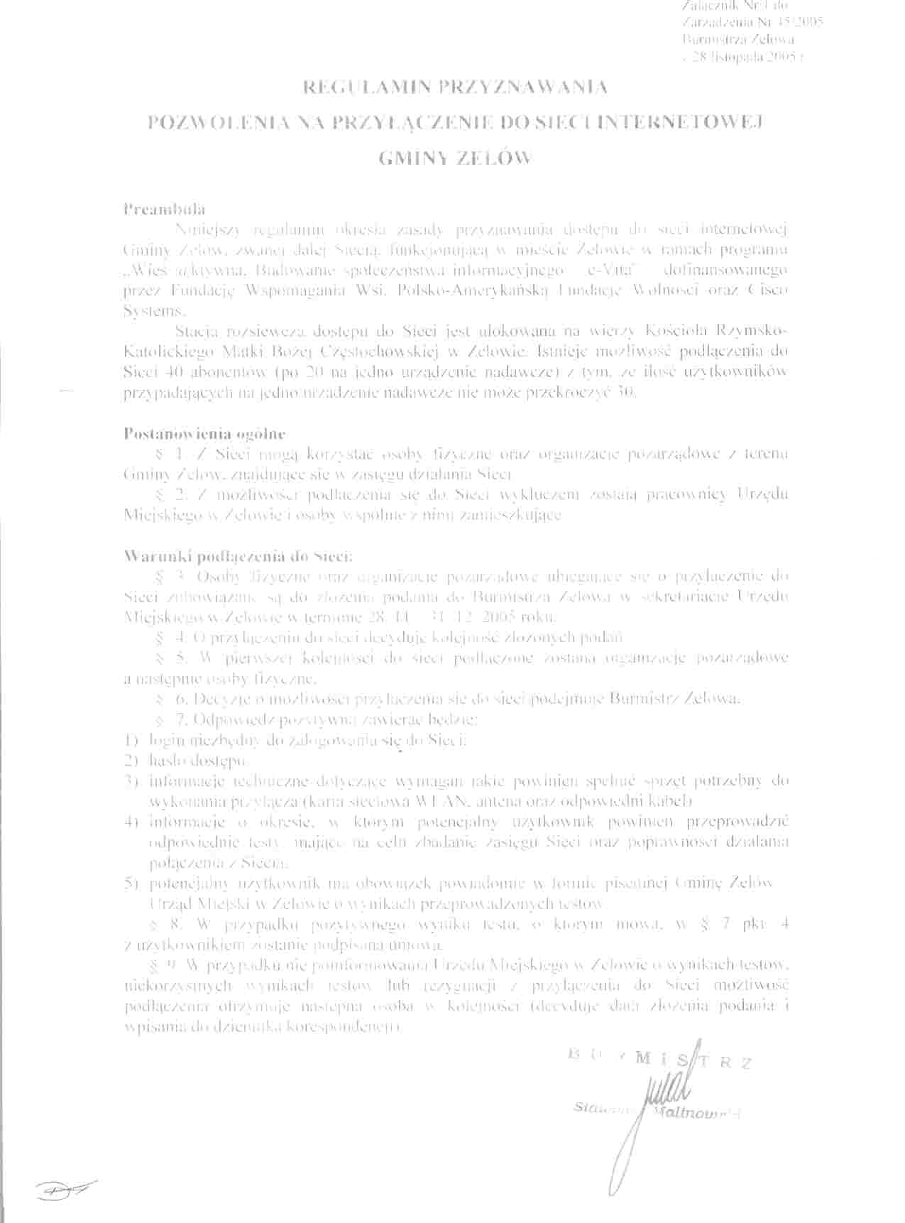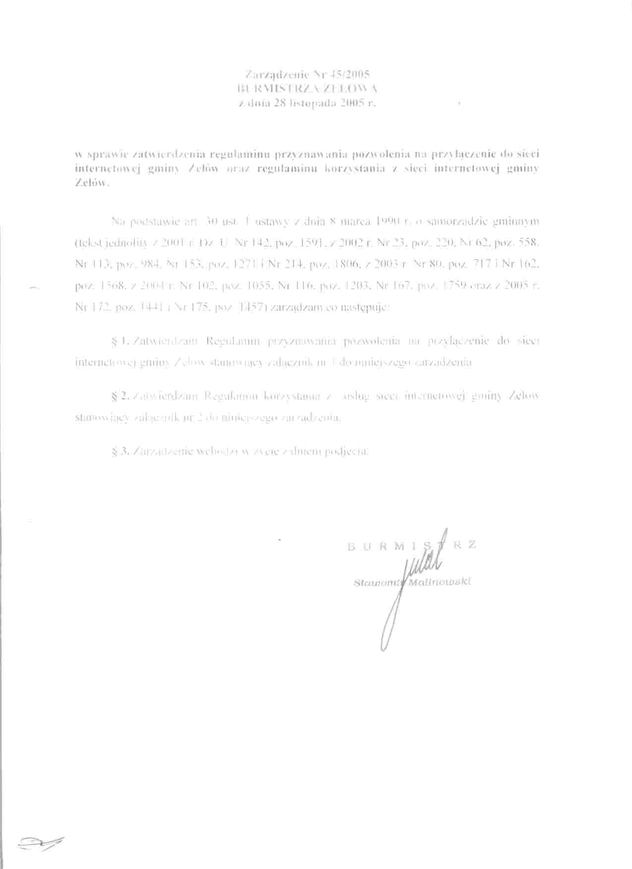 | Tytuł aktu prawnego - skrócony: | Zarządzenie w sprawie zatwierdzenia regulaminu przyznawania pozwolenia na przyłączenie się do sieci internetowej gminy Zelów oraz regulaminu korzystania zm sieci internetowej gminy Zelów. |