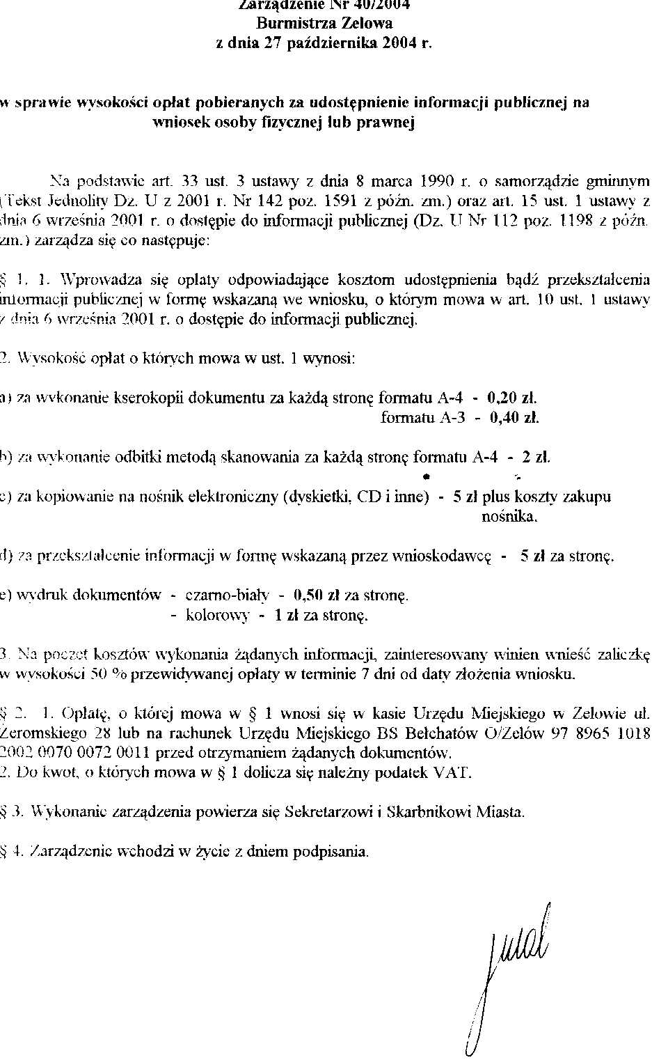 | Tytuł aktu prawnego - skrócony: | Zarządzenie w sprawie wysokości opłat pobieranych za udostępnienie informacji publicznej na wniosek osoby fizycznej lub prawnej |