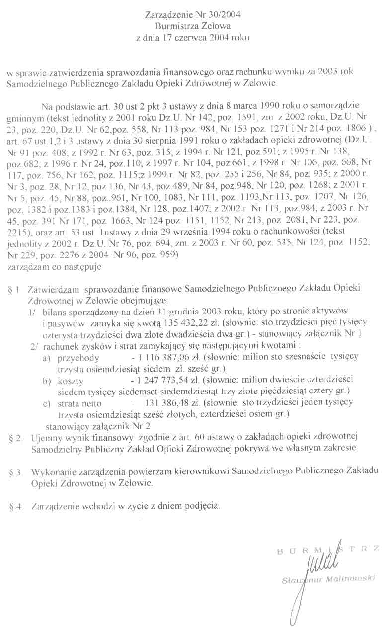 | Tytuł aktu prawnego - skrócony: | Zarządzenie w sprawie zatwierdzenia sprawozdania finansowego oraz rachunku wyniku za 2003 rok Samodzielnego Publicznego Zakładu Opieki Zdrowotnej w Zelowie. |