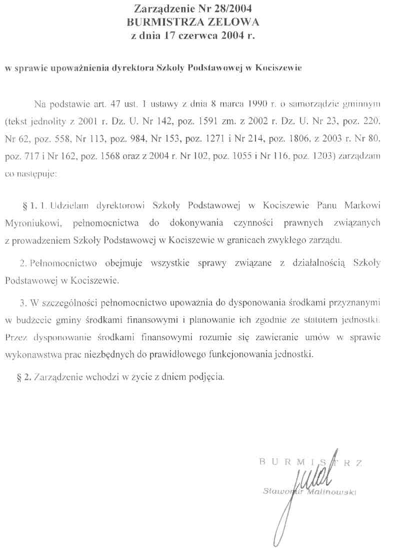 | Tytuł aktu prawnego - skrócony: | Zarządzenie w sprawie upoważnienia dyrektora Szkoły Podstawowej w Kociszewie. |