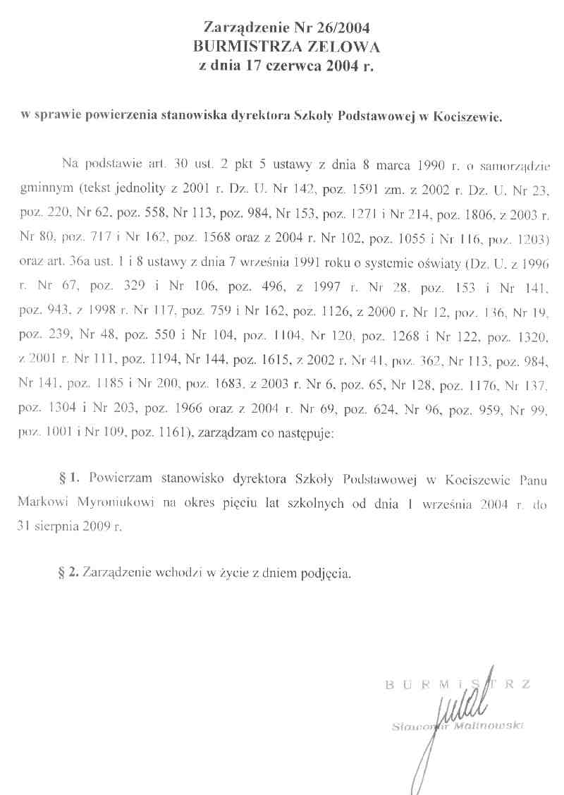 | Tytuł aktu prawnego - skrócony: | Zarządzenie w sprawie powierzenia stanowiska dyrektora Szkoły Podstawowej w Kociszewie. |