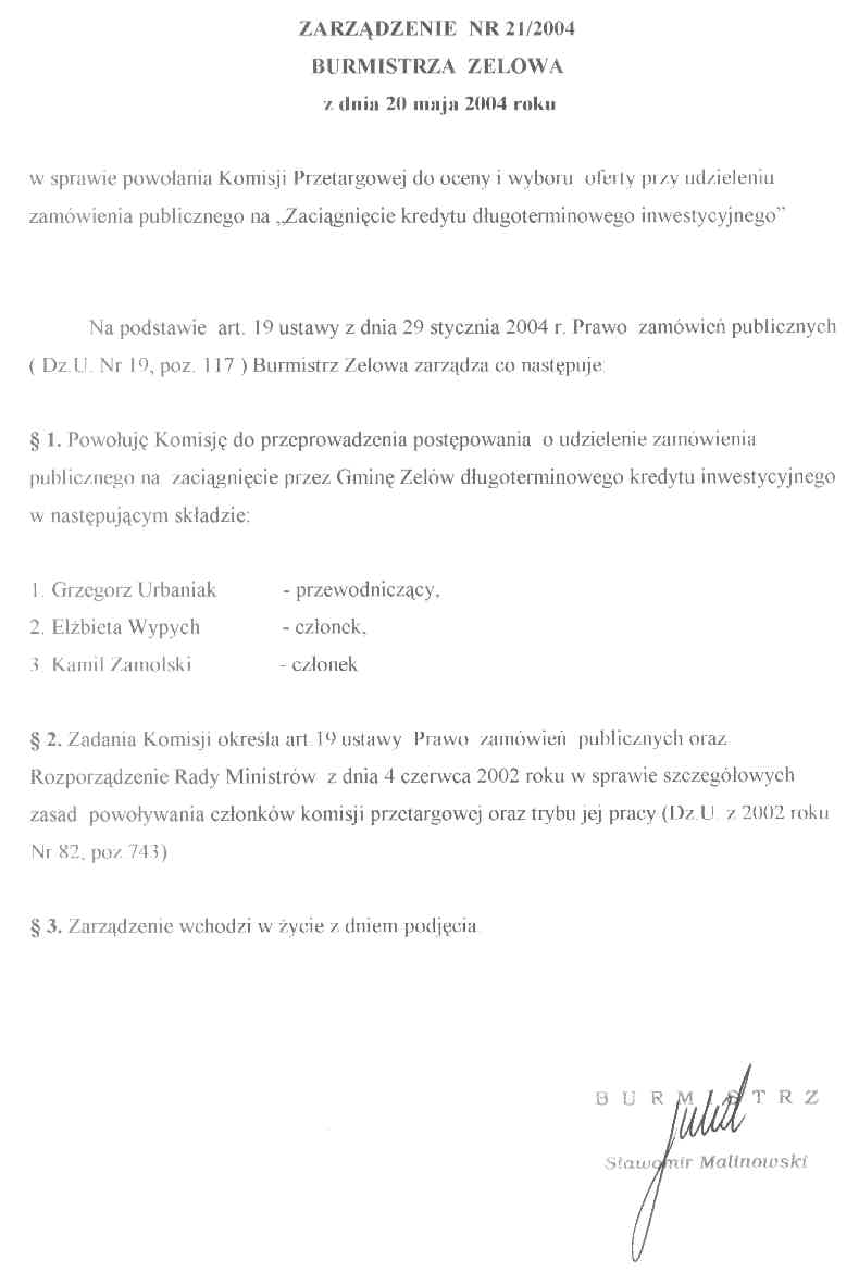 | Tytuł aktu prawnego - skrócony: | Zarządzenie w sprawie powołania Komisji Przetargowej do oceny i wyboru oferty przy udzielaniu zamówienia publicznego na "Zaciągnięcie kredytu długoterminowego inwestycyjnego". |
