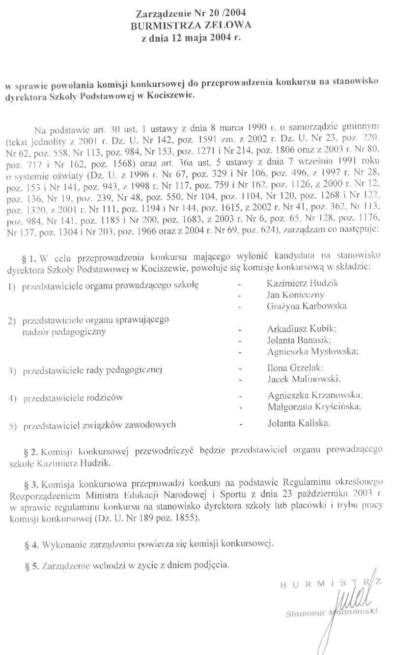 | Tytuł aktu prawnego - skrócony: | Zarządzenie w sprawie powołania komisji konkursowej do przeprowadzenia konkursu na stanowisko dyrektora Szkoły Podstawowej w Kociszewie. |