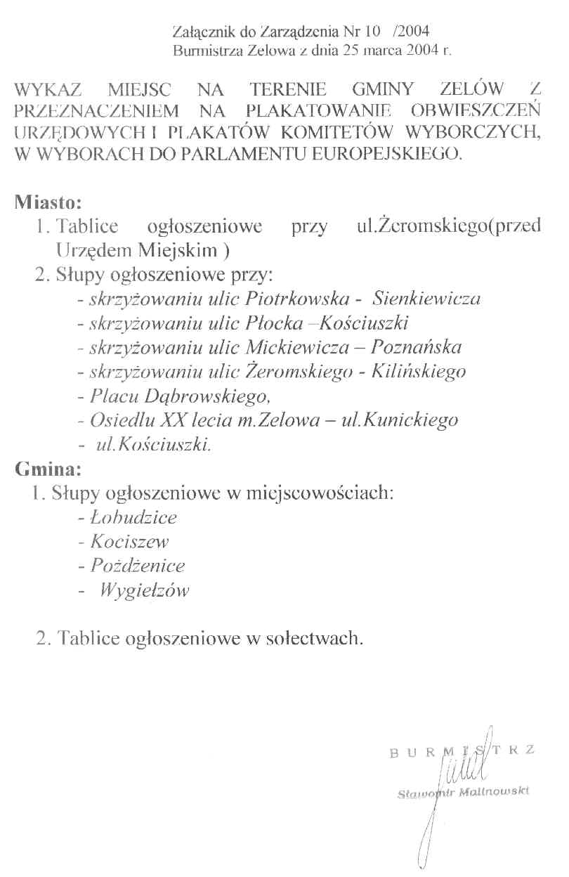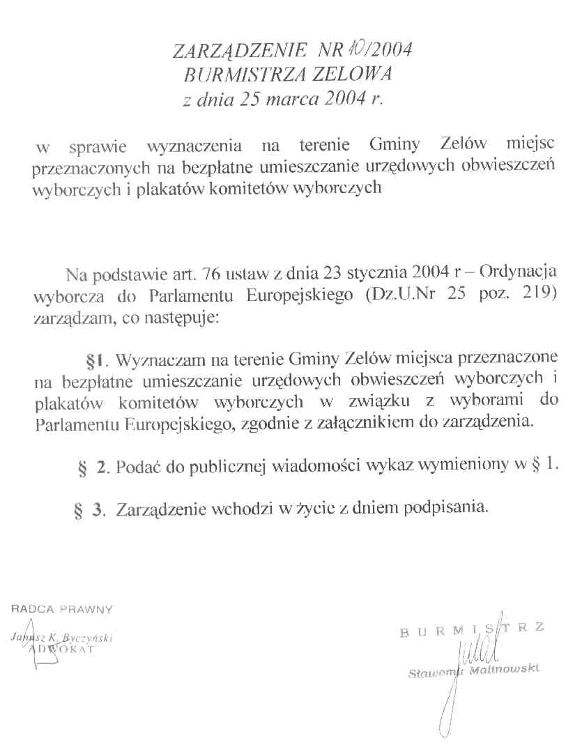 | Tytuł aktu prawnego - skrócony: | Zarządzenie w sprawie wyznaczenia na terenie Gminy Zelów miejsc przeznaczonych na bezpłatne umieszczanie urzędowych obwieszczeń wyborczych i plakatów komitetów wyborczych. |