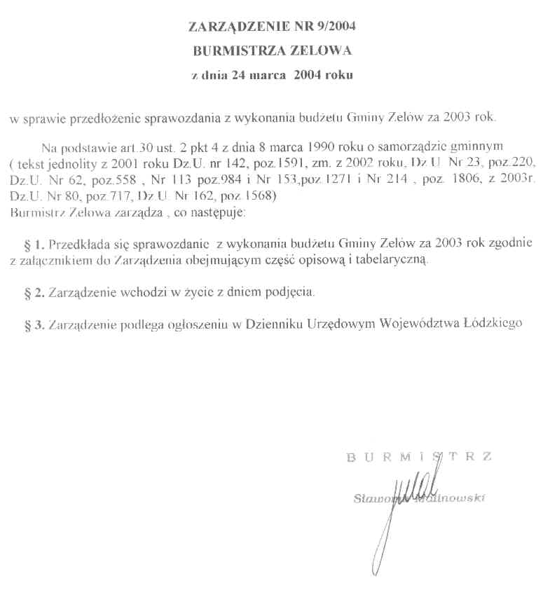 | Tytuł aktu prawnego - skrócony: | Zarządzenie w sprawie przedłożenia sprawozdania z wykonania budżetu Gminy Zelów za 2003 rok. |