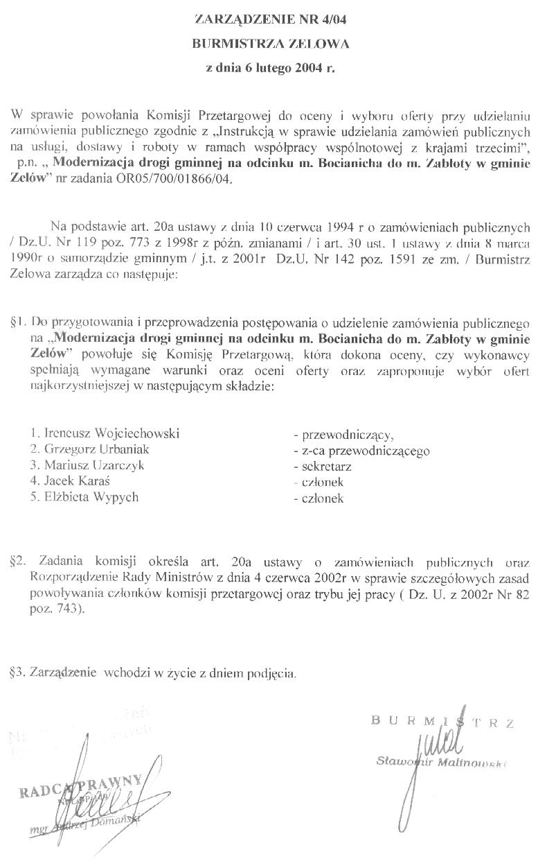| Tytuł aktu prawnego - skrócony: | Zarządzenie w sprawie powołania Komisji Przetargowej do oceny i wyboru oferty przy udzielaniu zamówienia publicznego zgodnie z "Instrukcją w sprawie udzielania zamówień publicznych na usługi, dostawy i roboty w ramach współpracy wspólnotowej z krajami trzecimi", p.n. "Modernizacja drogi na odcinku m. Bocianicha do m. Zabłoty w gminie Zelów" nr zadania OR05/700/01866/04. |