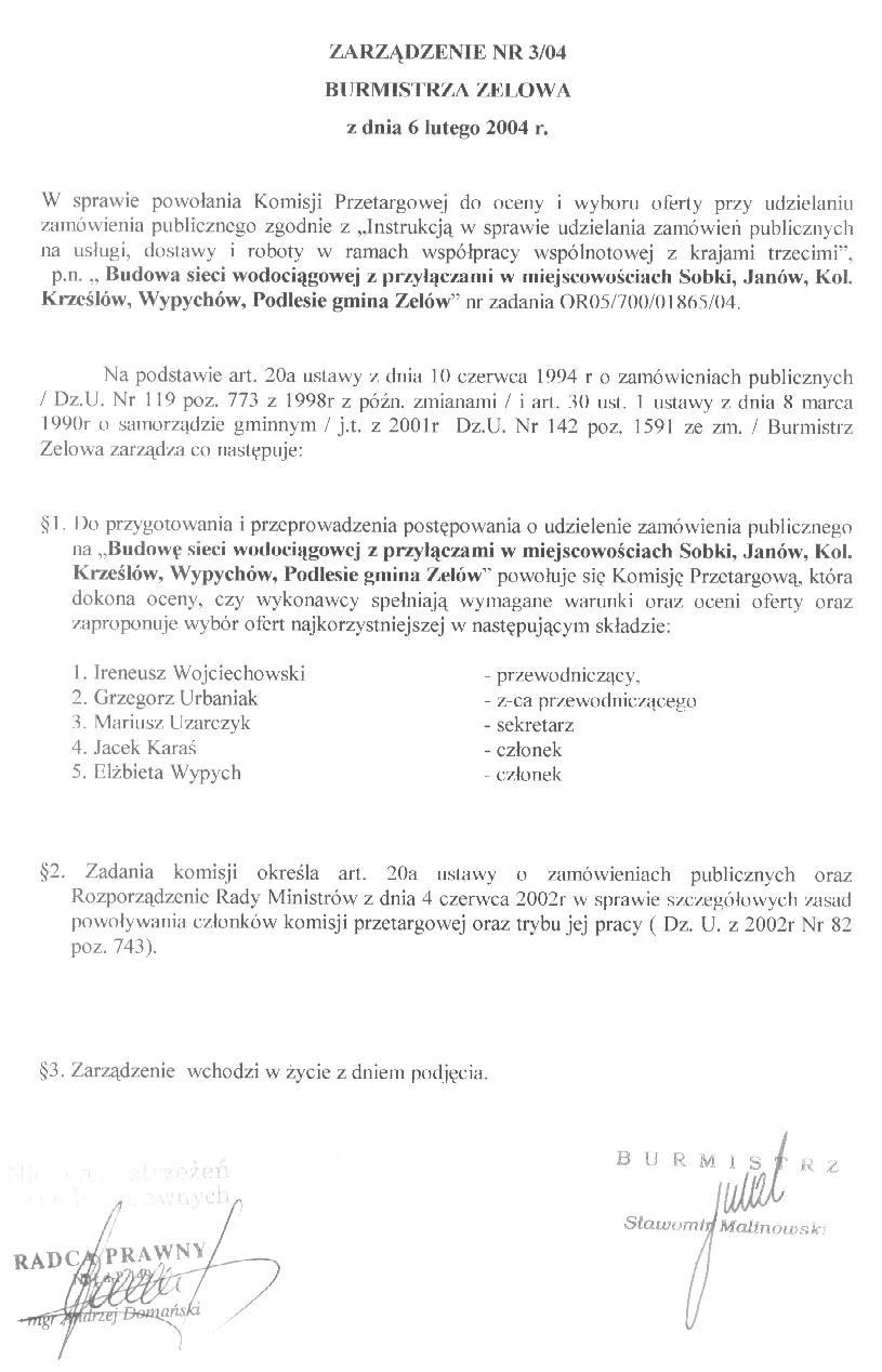 | Tytuł aktu prawnego - skrócony: | Zarządzenie w sprawie powołania Komisji Przetargowej do oceny i wyboru oferty przy udzielaniu zamówienia publicznego zgodnie z "Instrukcją w sprawie udzielania zamówień publicznych na usługi, dostawy i roboty w ramach współpracy wspólnotowej z krajami trzecimi", p.n. "Budowa sieci wodociągowej z przyłączeniami w miejscowościach Sobki, Janów, Kol. Krześlów, Wypychów, Podlesie gmina Zelów" nr zadania OR05/700/01865/04. |