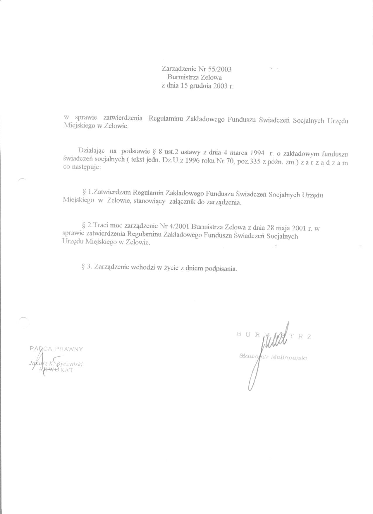 | Tytuł aktu prawnego - skrócony: | Zarządzenie w sprawie zatwierdzenia Regulaminu Zakładowego Funduszu Świadczeń Socjalnych Urzędu Miejskiego w Zelowie. |