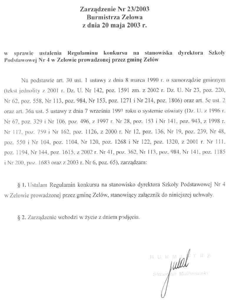 | Tytuł aktu prawnego - skrócony: | Zarządzenie w sprawie ustalenia Regulaminu konkursu na stanowiska dyrektora Szkoły Podstawowej nr 4 w Zelowie prowadzonej przez gminę Zelów. |