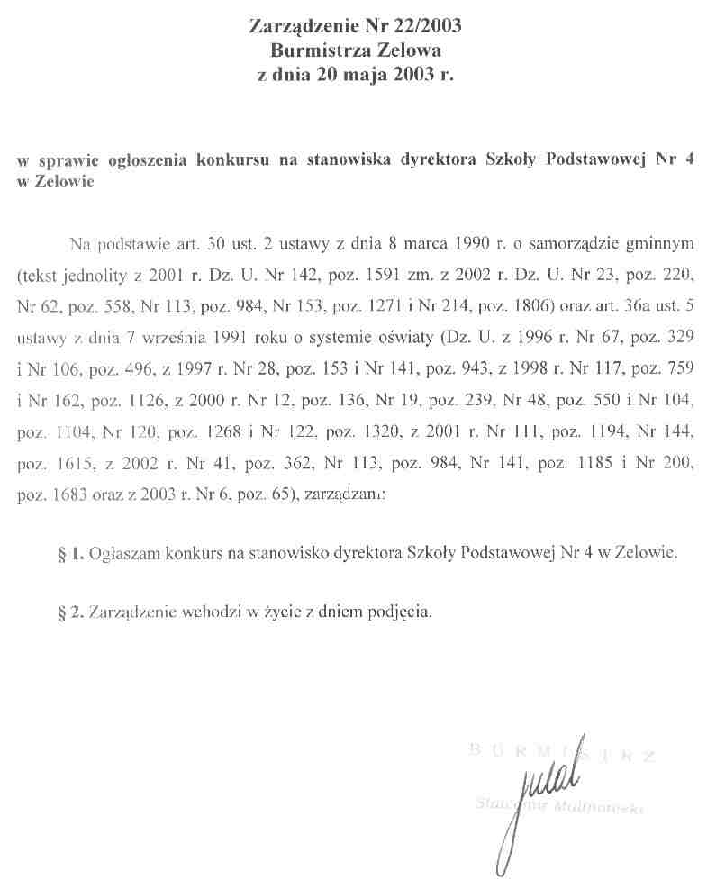 | Tytuł aktu prawnego - skrócony: | Zarządzenie w sprawie ogłoszenia konkursu na stanowisko dyrektora Szkoły Podstawowej Nr 4 w Zelowie. |