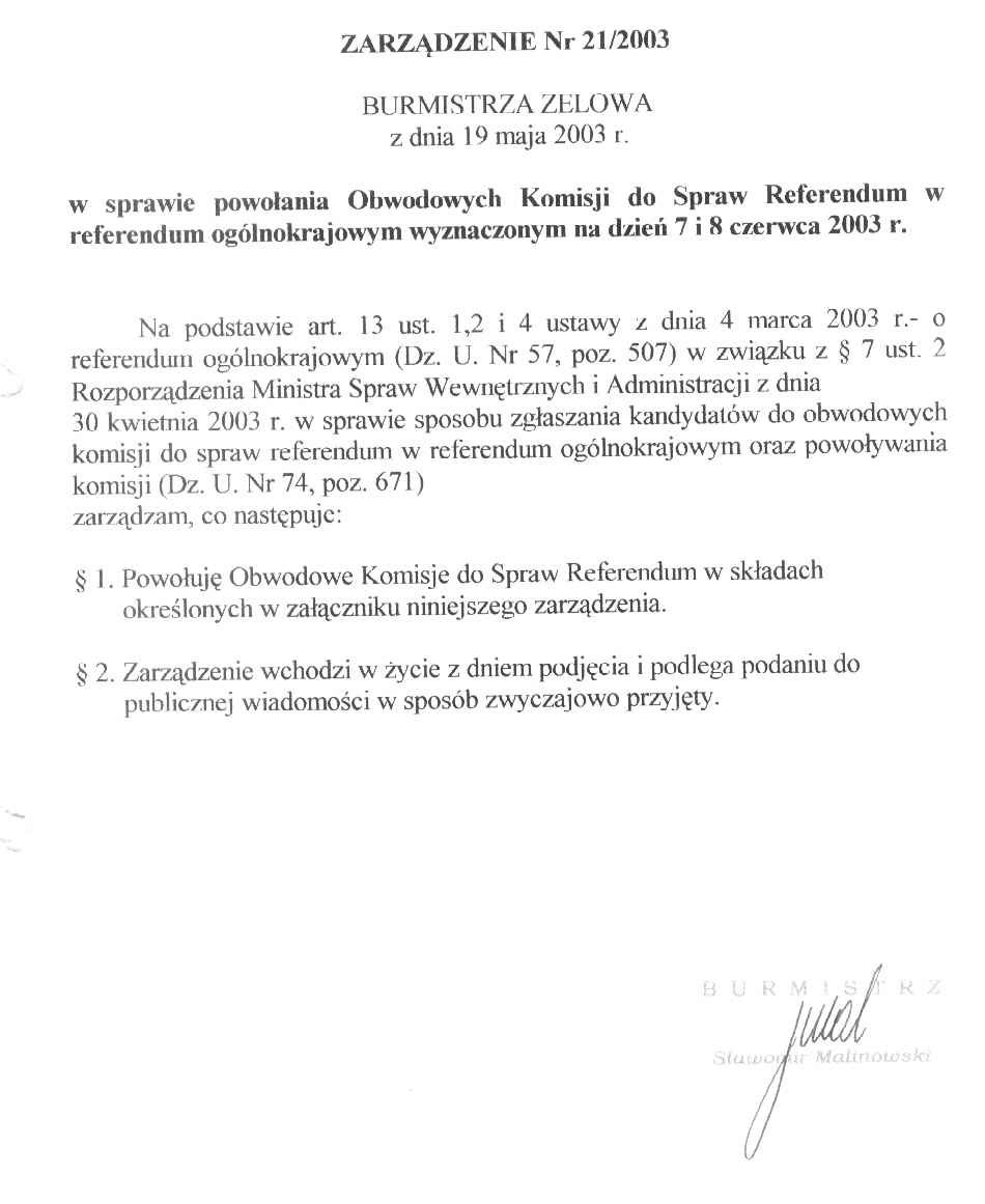 | Tytuł aktu prawnego - skrócony: | Zarządzenie w sprawie powołania Obwodowej Komisji do Spraw Referendum w referendum ogólnokrajowym wyznaczonym na dzień 7 i 8 czerwca 2003 r. |