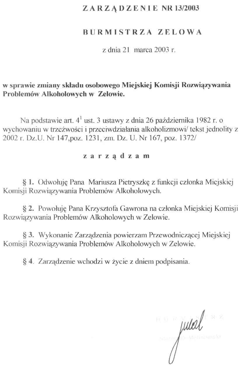 | Tytuł aktu prawnego - skrócony: | Zarządzenie w sprawie zmiany składu osobowego Miejskiej Komisji Rozwiązywania Problemów Alkoholowych w Zelowie. |