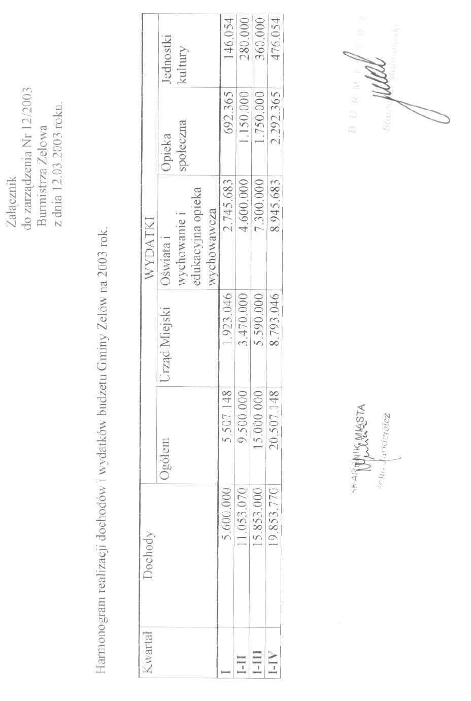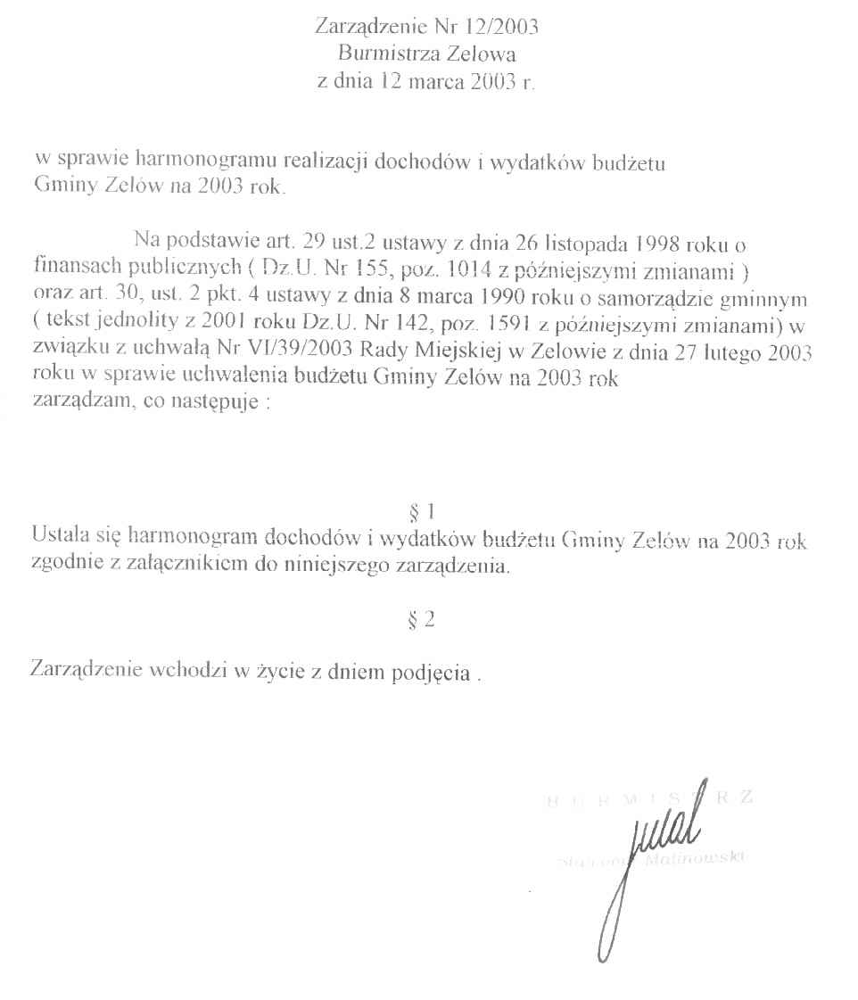 | Tytuł aktu prawnego - skrócony: | Zarządzenie w sprawie harmonogramu realizacji dochodów i wydatków budżetu Gminy Zelów na 2003 rok. |