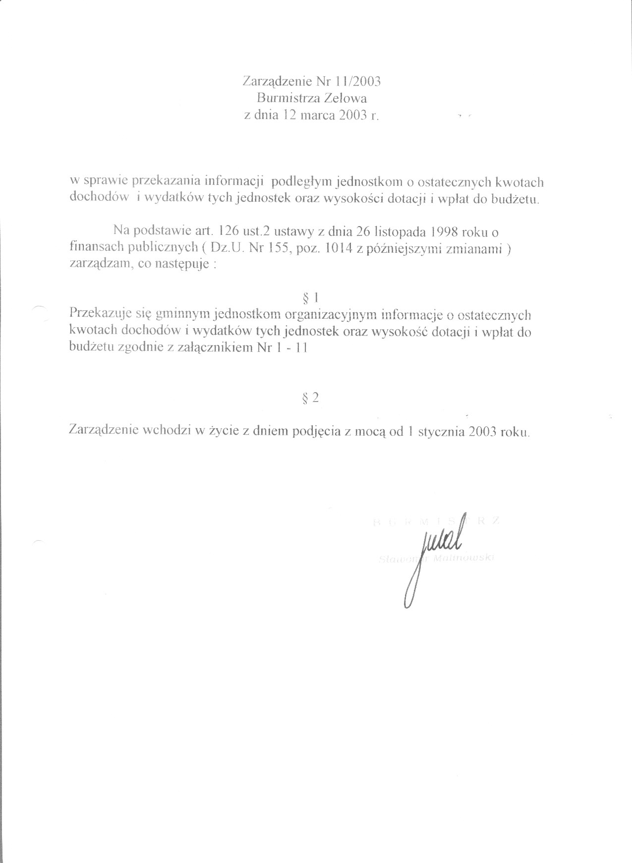 | Tytuł aktu prawnego - skrócony: | Zarządzenie w sprawie przekazania informacji podległym jednostkom o ostatecznych kwotach dochodów i wydatków tych jednostek oraz wysokości dotacji i wpłat do budżetu. |