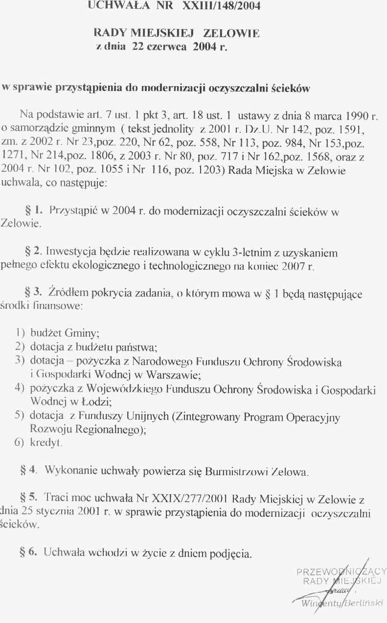 | Tytuł aktu prawnego - skrócony: | Uchwała Rady Miejskiej w Zelowie w sprawie przystąpienia do modernizacji oczyszczalni ścieków. |