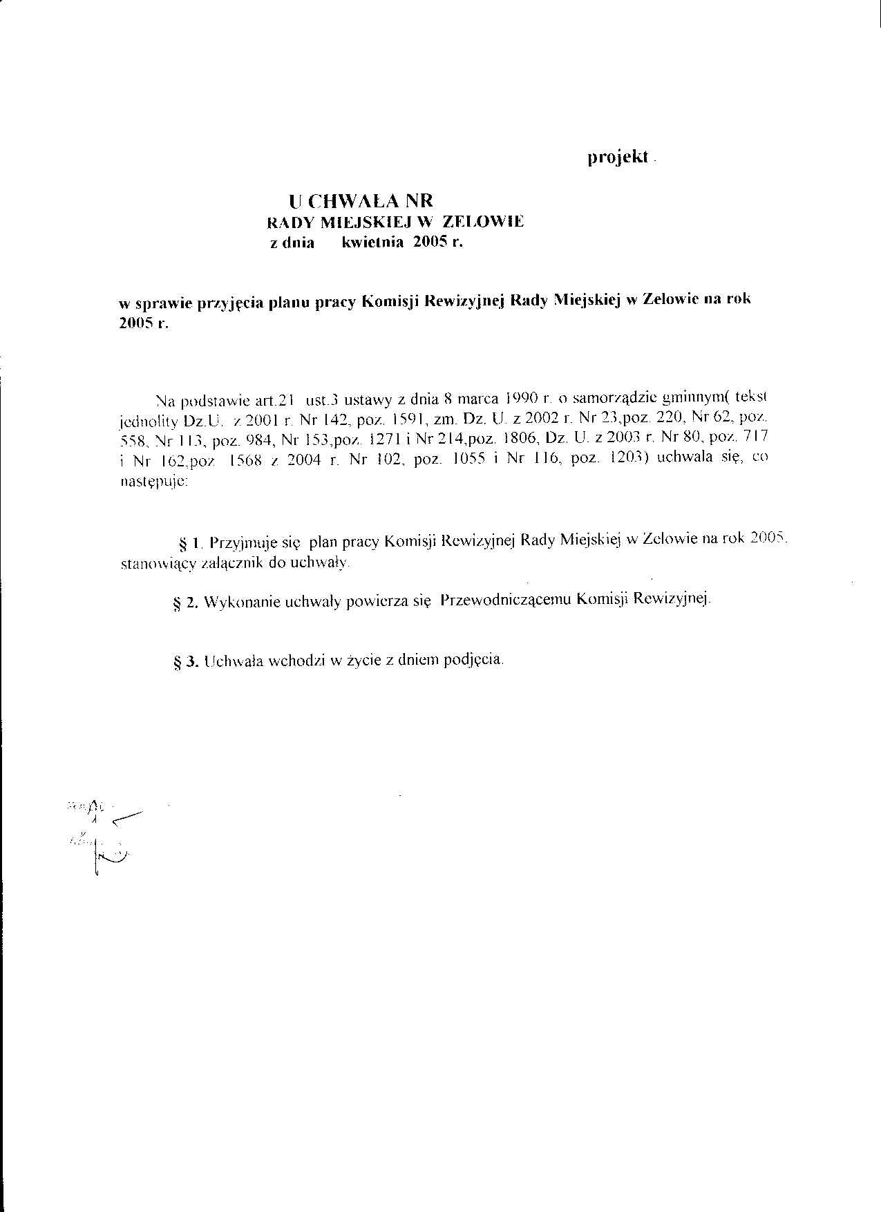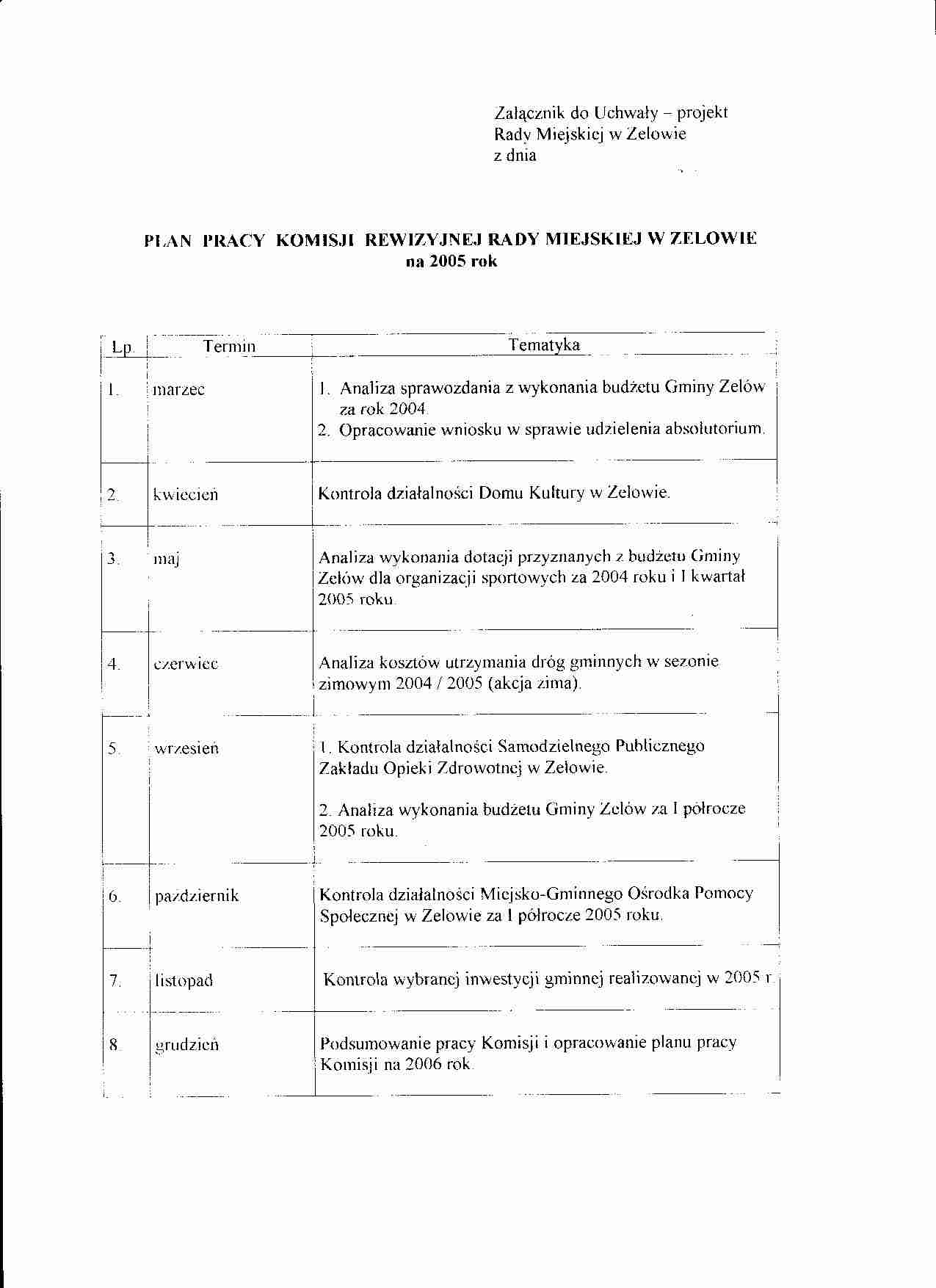 | Tytuł aktu prawnego - skrócony: | Uchwała w sprawie przyjęcia planu pracy Komisji Rewizyjnej Rady Miejskiej w Zelowie na 2005 rok |