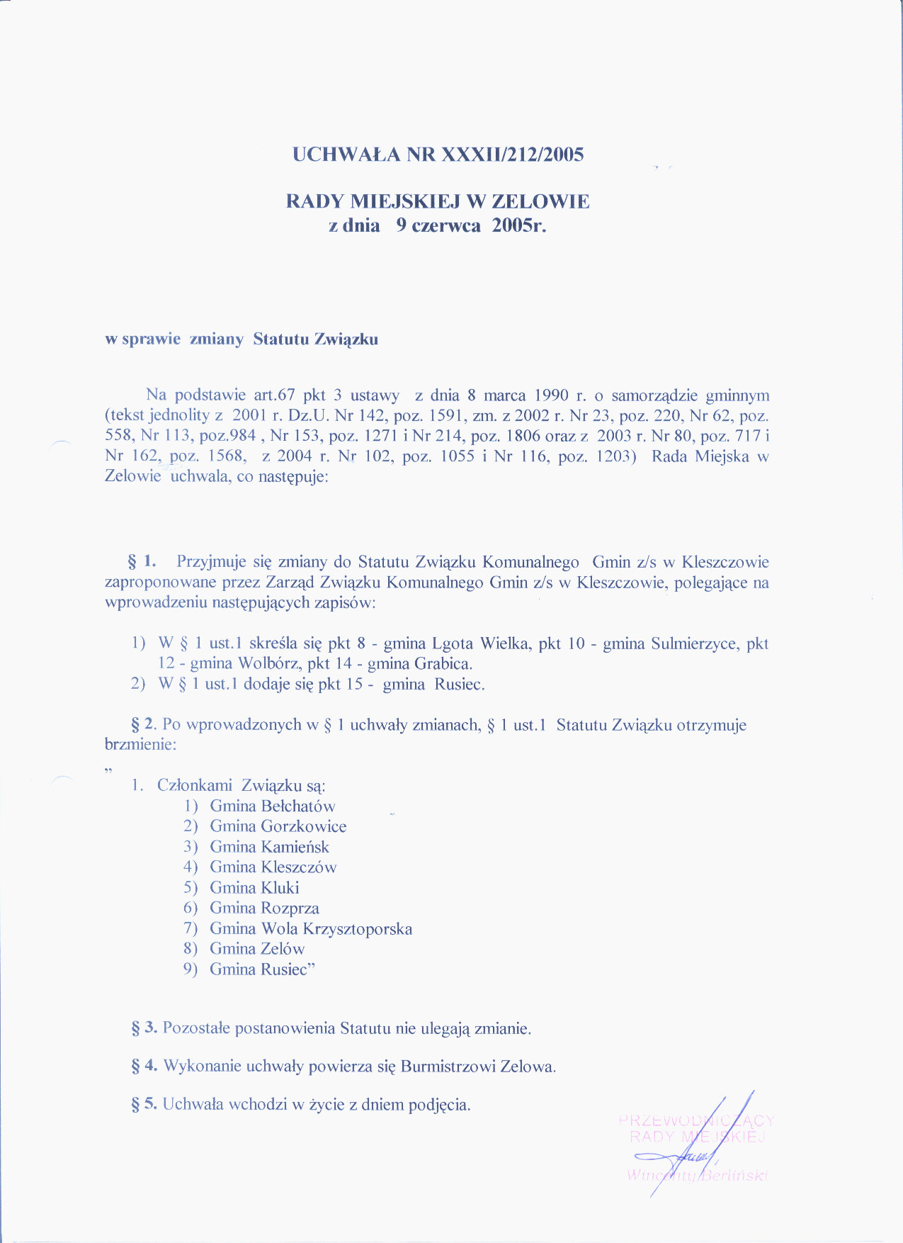 | Tytuł aktu prawnego - skrócony: | Uchwała Rady Miejskiej w Zelowie w sprawie zmiany Statutu Związku. |
