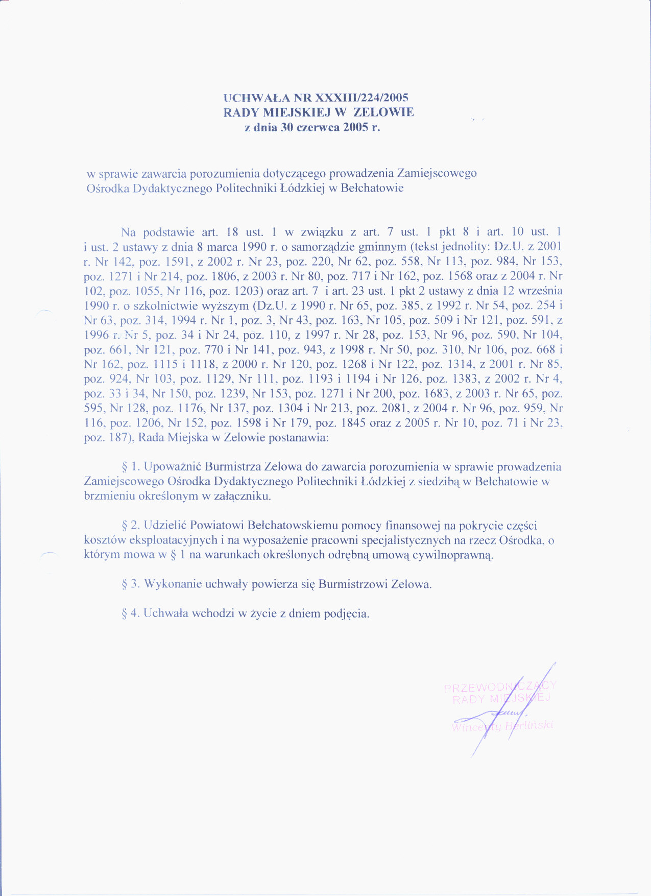 | Tytuł aktu prawnego - skrócony: | Uchwała w sprawie zaw. porozumienia dot. prowadzenia Zam. Oś. Dyd. Politechniki Łódzkiej w Bełchatowie. |