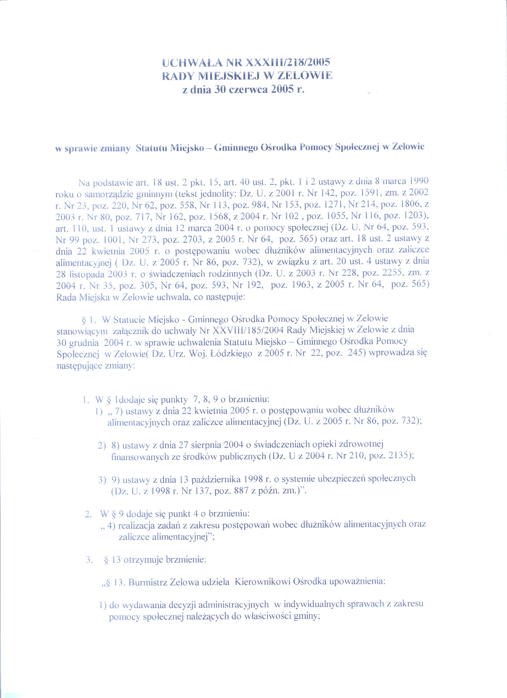 | Tytuł aktu prawnego - skrócony: | Uchwała w sprawie zmiany Statutu M-G Ośrodka Pomocy Społecznej w Zelowie. |