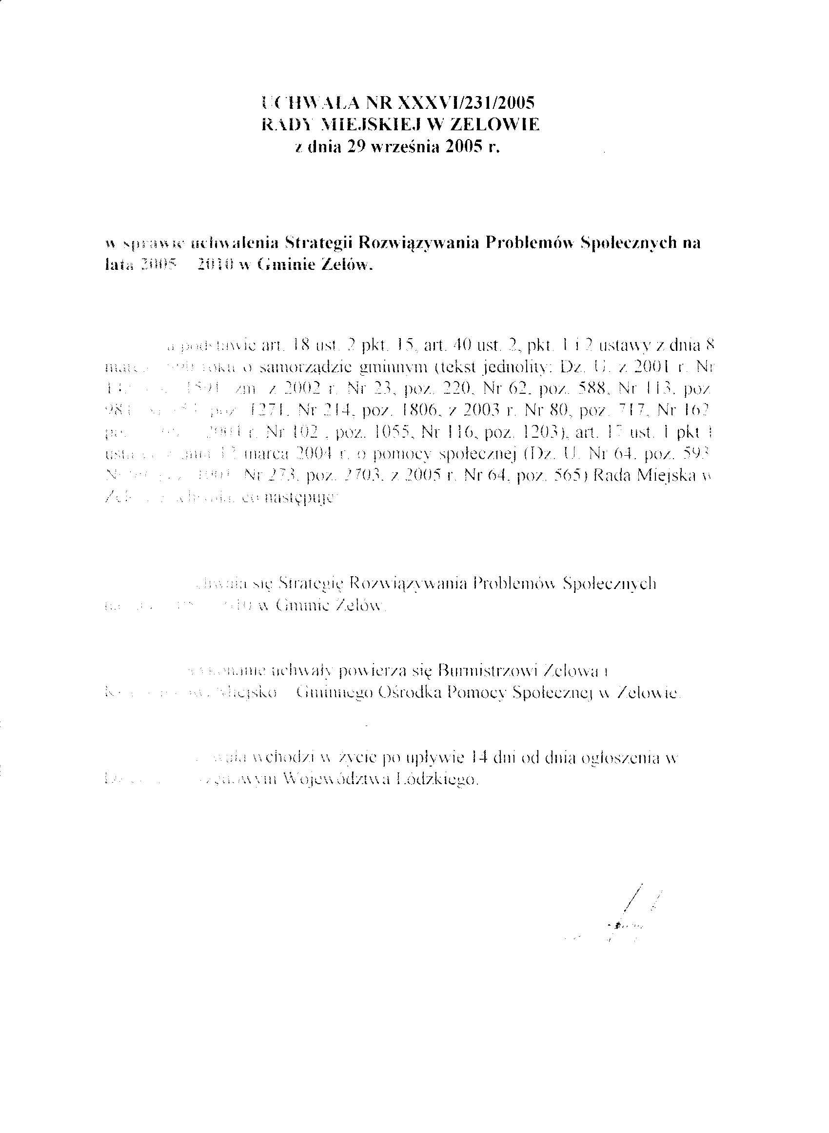 | Tytuł aktu prawnego - skrócony: | Uchwała w sprawie uchwalenia Strategii Rozwiązywania Problemów Społecznych na lata 2005 - 2010 w Gminie Zelów |