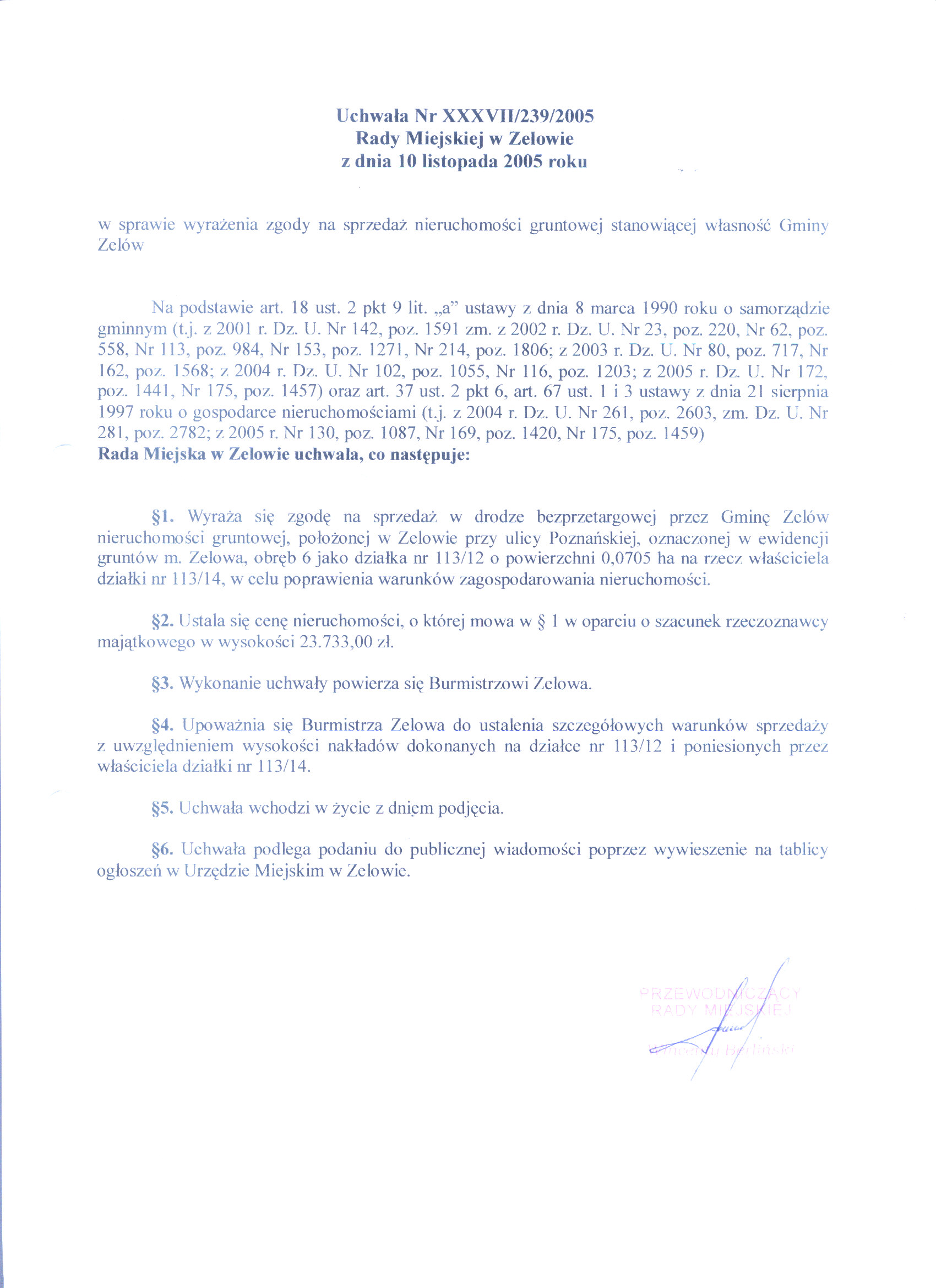 | Tytuł aktu prawnego - skrócony: | Uchwała w sprawie wyrażenia zgody na sprzedaż nieruchomości gruntowej stanowiącej własność Gminy Zelów. |