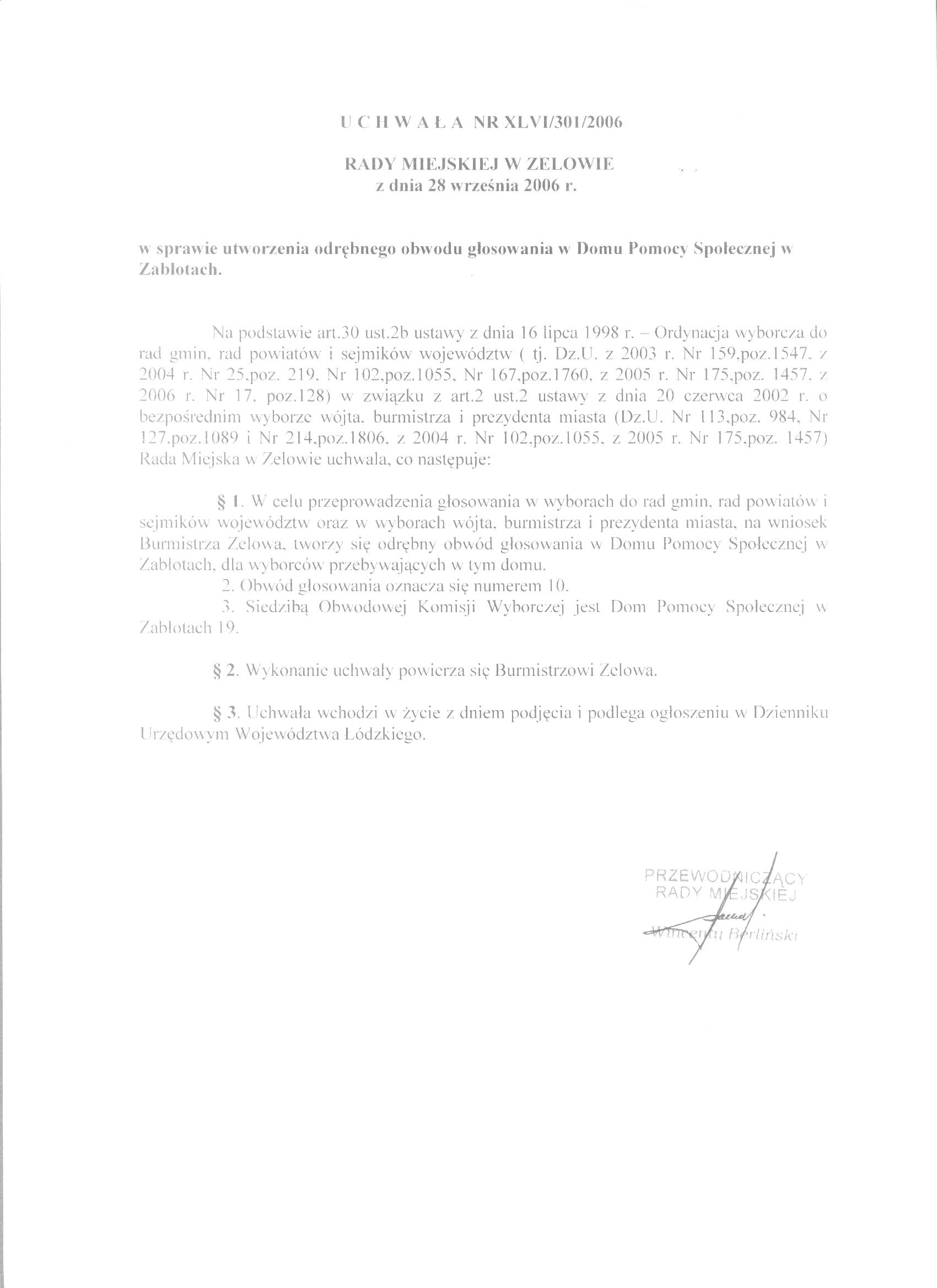 | Tytuł aktu prawnego - skrócony: | w sprawie utworzenia odrębnego obwodu głosowania w Domu Pomocy Społecznej w Zabłotach. |