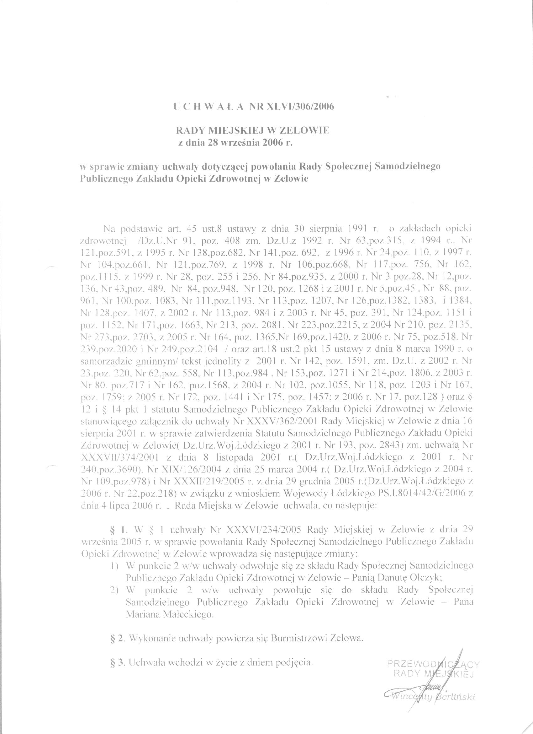 | Tytuł aktu prawnego - skrócony: | w sprawie zmiany uchwały dotyczącej powołania Rady Społecznej Samodzielnego Publicznego Zakładu Opieki Zdrowotnej w Zelowie. |